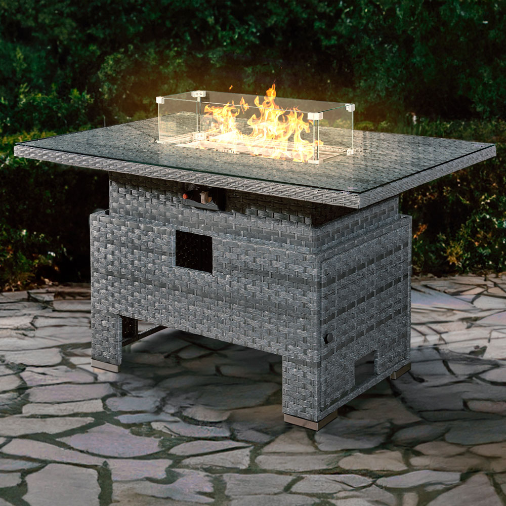 Royal Fire™ Icarus Rattan Rising Firepit Table in Ocean Grey - Easy-to-Use Electronic Igniter System with Stainless Steel Burner - Rising Table: Coffee and Dining Table in One - Hand Woven PE Rattan with Steel Frames with Convenient Hatch to store your Gas Tank - Includes Glass Wind Guard, PVC Cover, Fire Glass Pebbles and Stainless Steel Cover - Perfectly complements our Ocean Grey Rattan Furniture ranges Make our Icarus Rattan Rising Firepit Table the focal point of your outdoor living area, perfect for those blissful summer evenings when entertaining your guests. The spacious and inviting design allows more family and guests to gather round and bask in the light and warmth to ensure your garden parties are as memorable as possible. The Rising Table aspect is the perfect way to combine the relaxation of a Coffee Table with the necessity of a Dining Table, allowing you to go from dining to casual lounging as the moment takes you. Meanwhile, the Firepit feature will transform your garden set to the next level with dazzling flames and gentle warmth. Ignite the flame with our electronic ignitor button, then control the flame to your desired intensity with the dial. Comes with a Glass Wind Guard, PVC Cover, Stainless Steel Lid (for when not-in-use) and FREE Fire Glass Pebbles. Our Icarus Firepit range uses LPG. The Gas Tank can fit inside the Table itself. It's recommended to measure the internal space of this item before purchasing your Propane Tank. BTU: 60000 1 x Royal Fire™ Icarus Rattan Rising Firepit Table in Ocean Grey. W: 132cm, D: 88cm, H: 55-75cm. Weight: 49.5kg REF: 107090