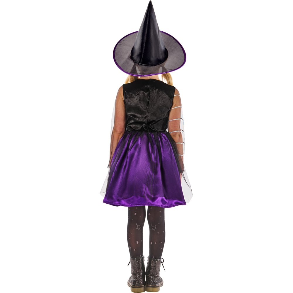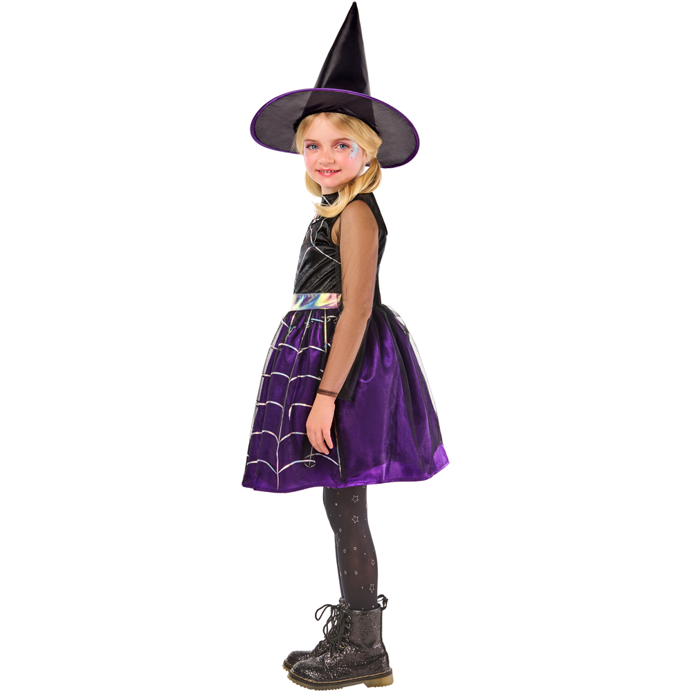 Let your little ones weave their own web of magic with the Rubies Masquerade Kids Cobweb Witch Costume Small. This magical outfit includes a stunning dress and a matching hat, perfect for any aspiring witch. The dress features a rich purple and black colour scheme with a detailed cobweb pattern that adds a touch of spooky elegance. The flowing skirt and long sleeves make it comfortable for all-night wear. The matching witch hat complements the dress perfectly and completes the enchanting look. This costume is perfect for Halloween or any mystical party. Your little witch will be casting spells and potions in no time. The costume has undergone comprehensive safety testing where applicable, meeting all relevant regulations.
