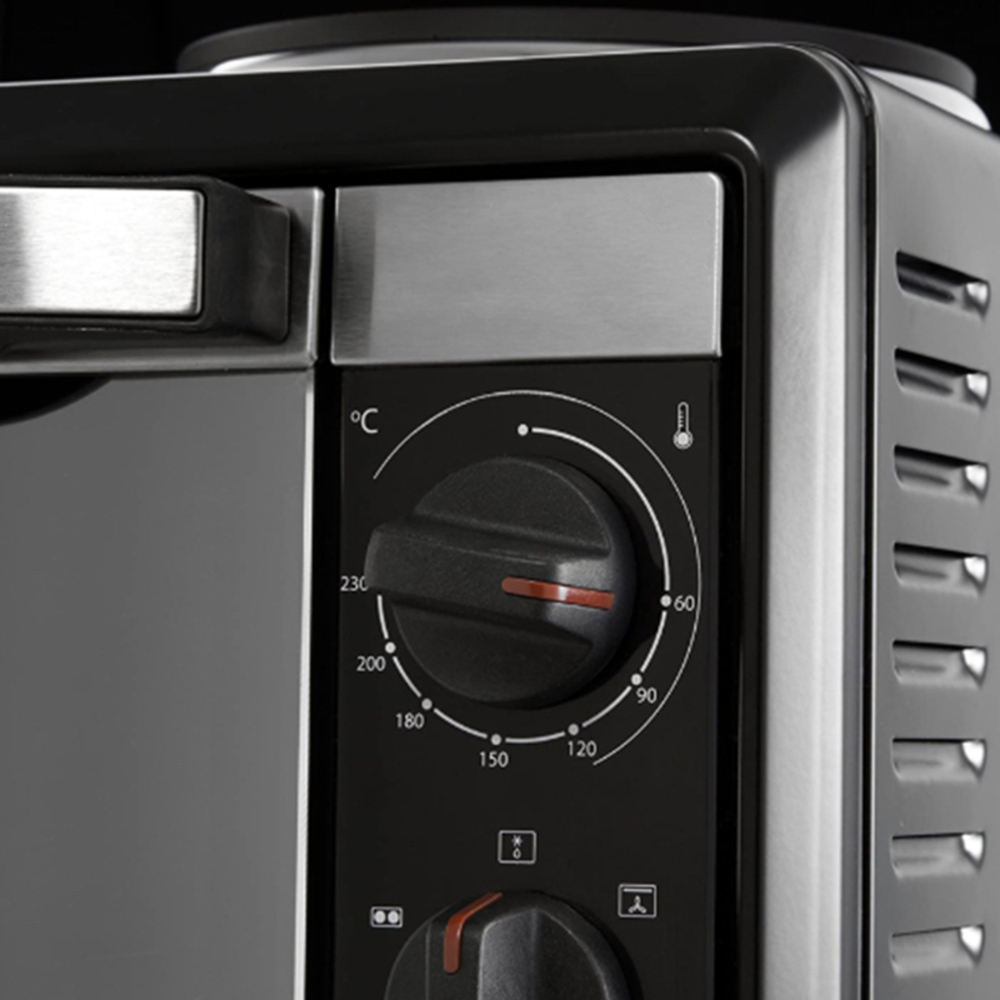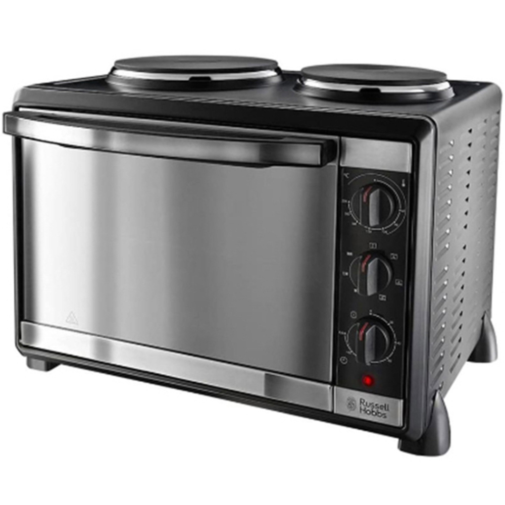 Unlock culinary magic with the Russell Hobbs 22780 Silver 30L Mini Oven with 2 Hot Plates. This compact electric oven has multiple functions, including grilling, roasting, baking, frying, and boiling. The 30-liter fan-assisted oven with thermostatic controls can be set to 60 to 230 degrees Celsius and has a keep-warm feature. The oven is equipped with a double hotplate, 1000W for the large plate and 750W for the small, that can be used separately or together. Including a baking tray, grill rack, and tray handle, this oven has a 120-minute timer with an auto shut-off feature and a ready bell. Plus, when registered online, the two-year guarantee is extended to three years. Note: It is not possible to use the oven and hotplates simultaneously.