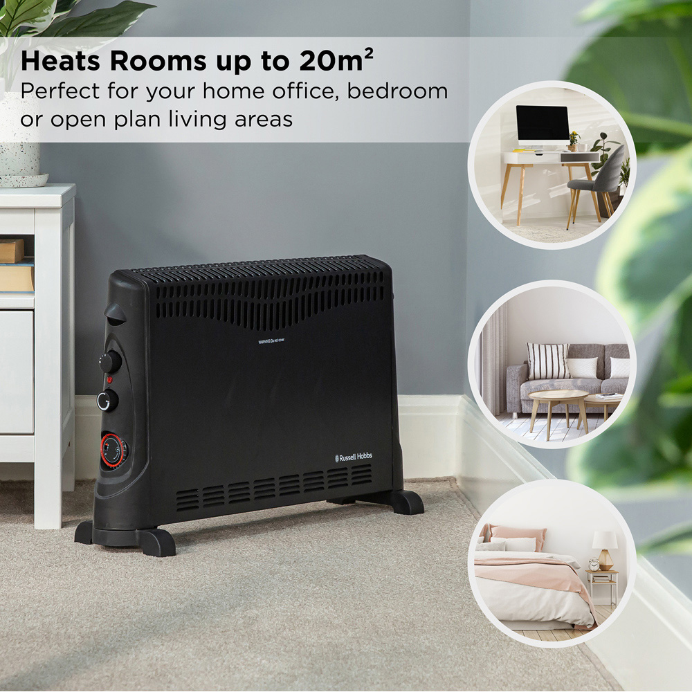 The Russell Hobbs RHCVH4002B Black Convection Heater with Timer 2KW is a powerful and versatile heating solution for your home. With a maximum heat output of 2000W, it offers three flexible settings – 750W, 1250W, and 2000W, allowing you to adjust the warmth according to your needs. The built-in thermostat ensures the perfect temperature by automatically switching the heater on and off to maintain the desired heat level. Ideal for rooms up to 20m2, such as living rooms or double bedrooms, this freestanding heater features an integrated mechanical timer, enabling you to heat your home according to your daily routine. The lightweight design, integrated handles, and 1.45m power cord make it easy to move from room to room. Additionally, the frost protection failure automatically activates if the room temperature drops to 5 degrees, ensuring that your space stays comfortably warm. For added safety, the heater includes overheat protection. It comes with a two-year guarantee upon registration.