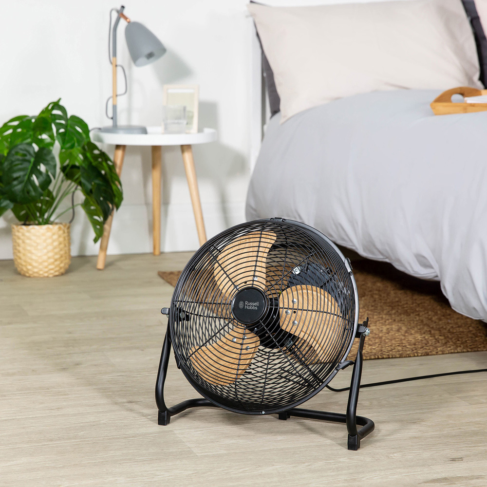 Experience optimal cooling with the Russell Hobbs RHGF1221WDB Black Scandi Floor Fan. This compact powerhouse delivers optimal cooling with three speed settings; namely low, medium, and high. Its tilt function ensures the airflow reaches any corner of the room, and is easy to set up. The straightforward rotary switch allows you to switch modes quickly and effortlessly. Lightweight and compact, this fan comes with a 1.5m power cord that makes it easy to move around. For added peace of mind, it comes with a one-year guarantee, plus an extra year upon registration.