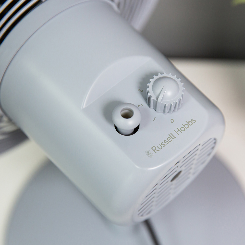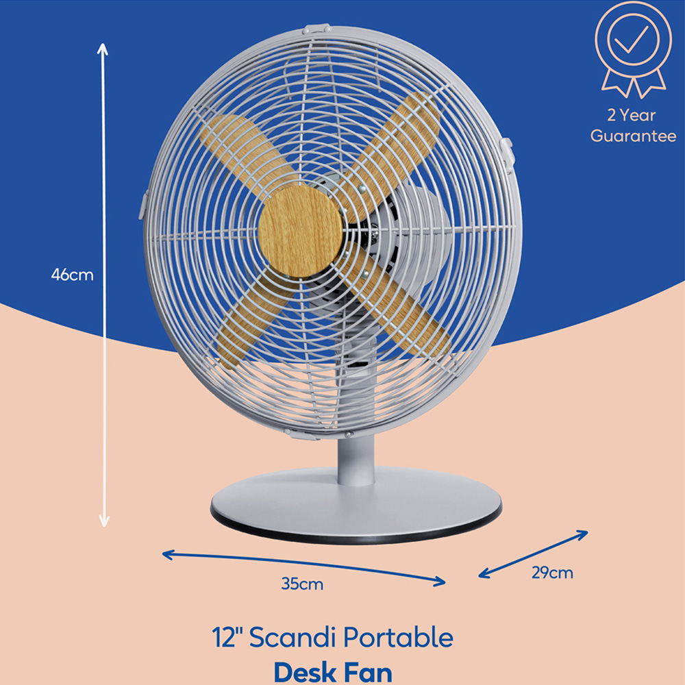 Elevate your comfort and style with the Russell Hobbs RHMDF1201WDG Grey and Wood Effect Scandi Style Desk Fan 12in. Equipped with three-speed settings, it gives you the power to customise your cooling experience. Inspired by aerodynamics, the fan features four rounded edge blades modelled after aeroplane wings. This ensures smooth and quiet operation. With its compact 12-inch size, it can seamlessly fit into even the most compact spaces. For added peace of mind, it comes with a one-year guarantee, plus an extra year upon registration.