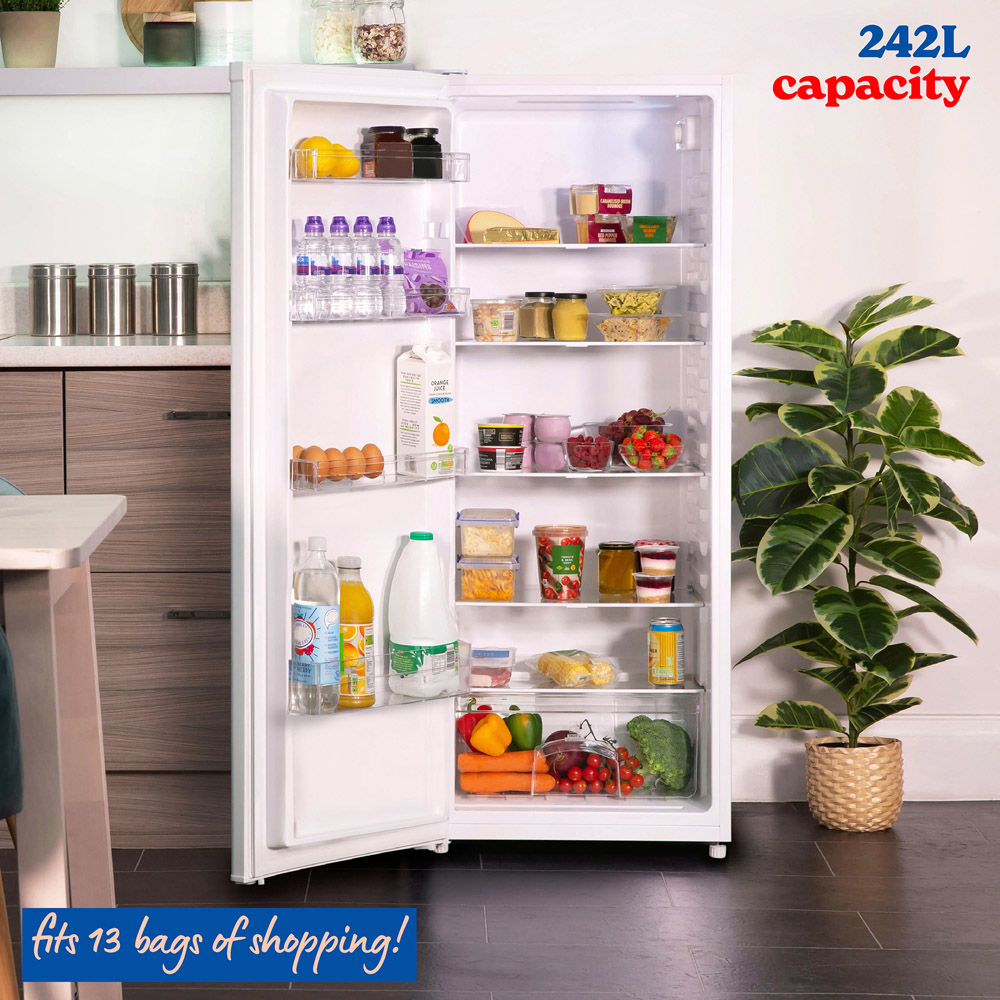This Russell Hobbs Freestanding Larger Fridge is the perfect addition to your kitchen or utility room, ideal for storing your favourite groceries. There’s 242L of fridge space to easily fit up to 13 bags of food shopping, giving you plenty of room for family favourites and meal prep. The 55cm fridge is designed to slot seamlessly into your home, and still provide you with plenty of storage for fresh food and treats. The fridge space features five handy glass shelves, four of which can be removed if you ever need space for larger items, as well as a salad crisper drawer for organising your leafy greens and soft fruits. There are four racks in the door, ideal for taller drinks cartons and bottles. This model features an adjustable thermostat, so you can precisely set the temperature to suit the contents of your fridge. There’s also a reversible door for versatility, so you can place your appliance wherever you want it in your kitchen or utility room. Plus, there are adjustable feet to ensure your fridge is stable on uneven surfaces. For added peace of mind, this fridge comes with a 2-Year Guarantee upon registration. This way, in the unlikely event something goes wrong, you know we'll always be on hand to help.