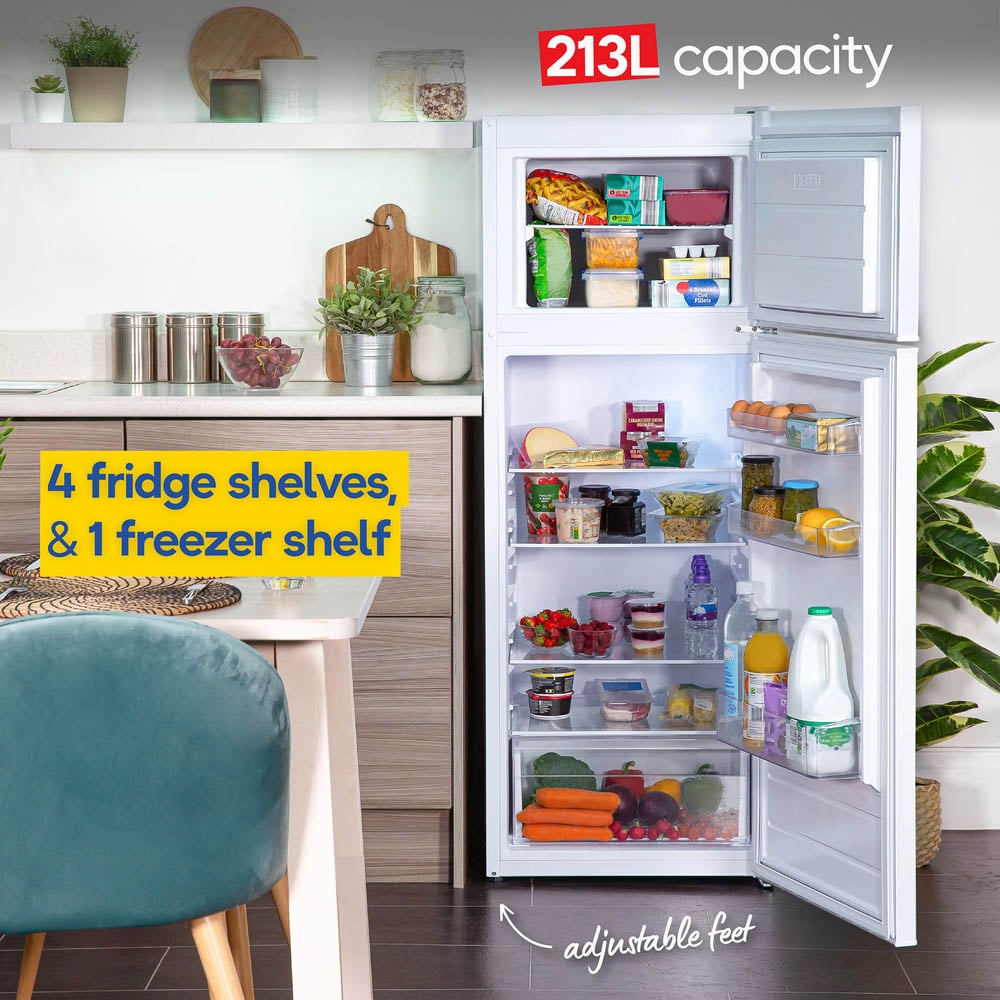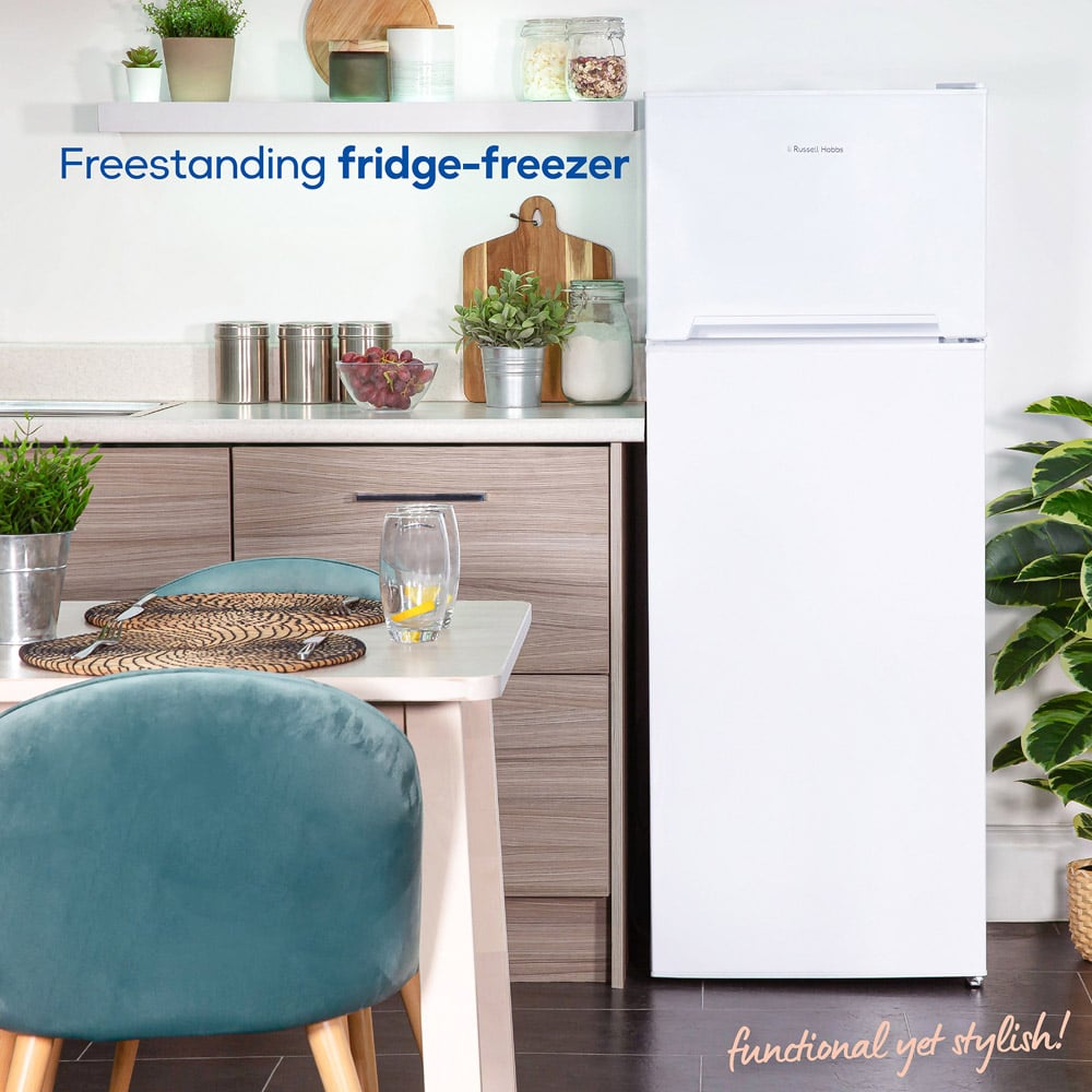 This Russell Hobbs Freestanding Top Mounted Fridge Freezer is both functional and contemporary with its sleek white design. With a generous 213L capacity - 171L for the fridge and 42L for the freezer, it's got all the space you need. Inside the fridge, there’s four glass shelves, three door racks, and a crisper compartment, providing ample room for your fresh goods. And not to forget the 42L freezer section which is perfect for stocking up on your frozen treats and family favourites. Even better, with its top-mounted design it’s super easy to grab your frozen goods. Plus, it's got adjustable feet and a reversible door, ensuring it fits seamlessly into any home and can be moved around effortlessly to suit your needs. For added peace of mind, this Russell Hobbs Fridge Freezer comes with a 1-Year Guarantee, plus an extra year upon registration. This way, in the unlikely event something goes wrong, you know we'll always be on hand to help.