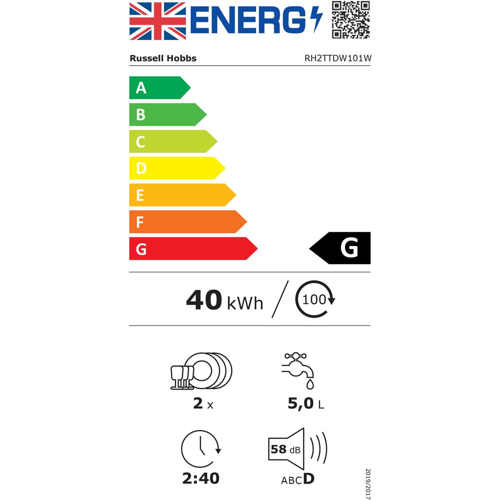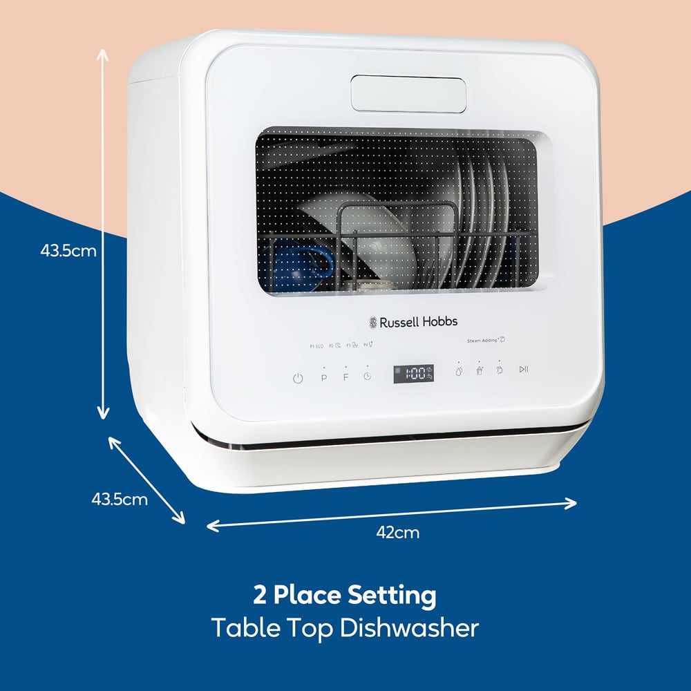 Make a sleek and functional addition to your kitchen with the Russell Hobbs RH2TTDW101W White Dishwasher. This compact dishwasher with a classic design can be placed neatly in any space of your choice. You can easily tackle dishes for two people with its two-place setting capacity, fitting plates with 9 to 9.5 inch (22 to 24cm) size. It features eco, one-hour, glass and rapid modes to ensure sparkling clean results for every type of load. It also has rinse, baby care and steam functions with a spacious drawer and a convenient mug shelf with wine stem support. This compact dishwasher can be set up wherever there is a plug facility. You can plumb it in or simply fill the built-in water tank or attach it to a tap (tap connection requires a separate kit, which is not supplied). This dishwasher comes with a one-year guarantee for added convenience.