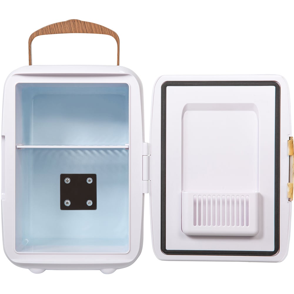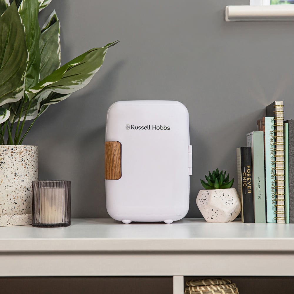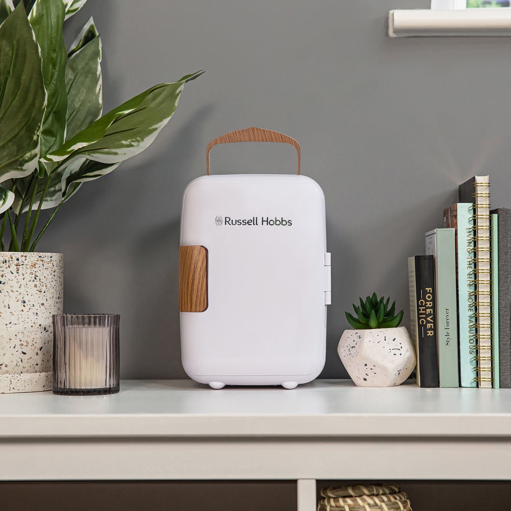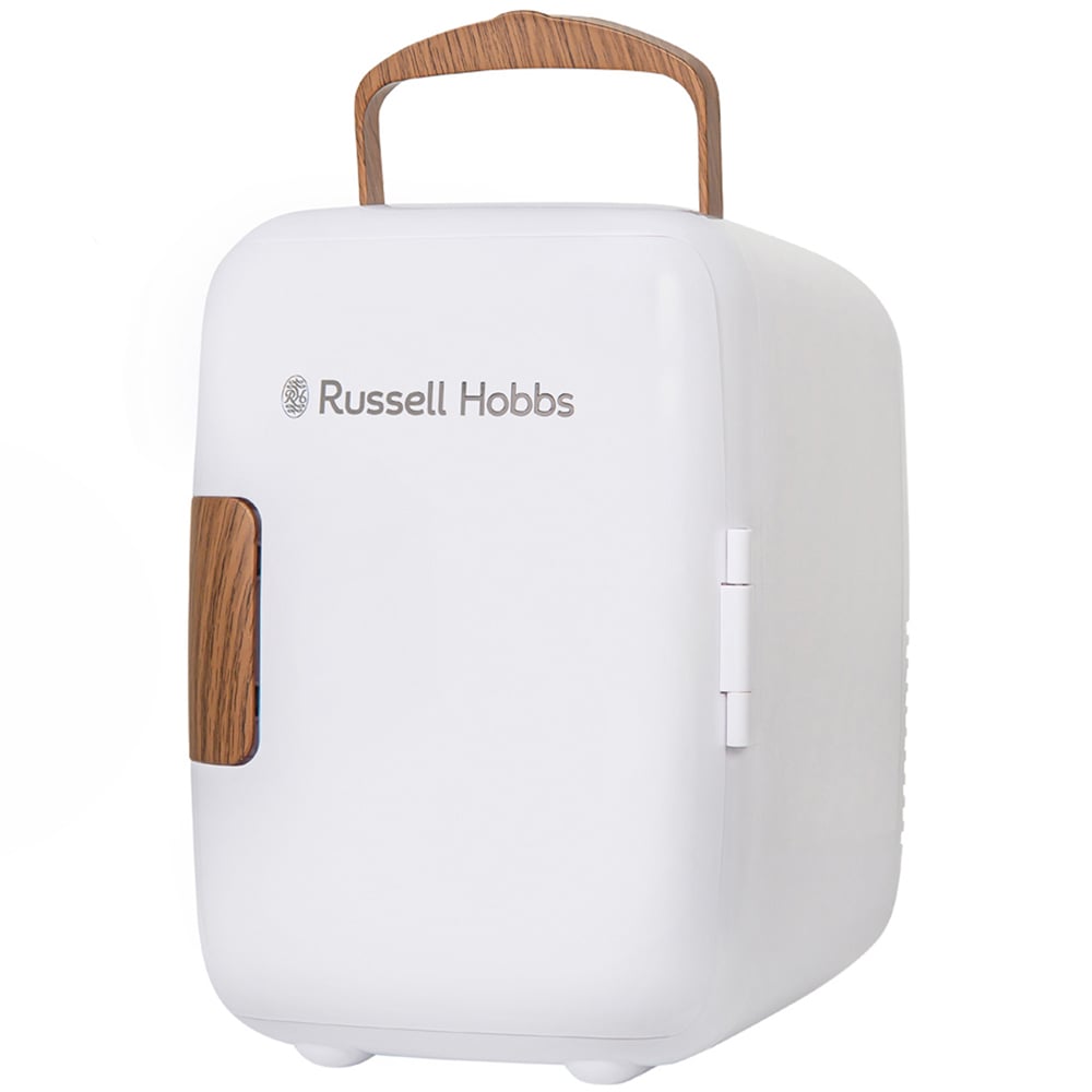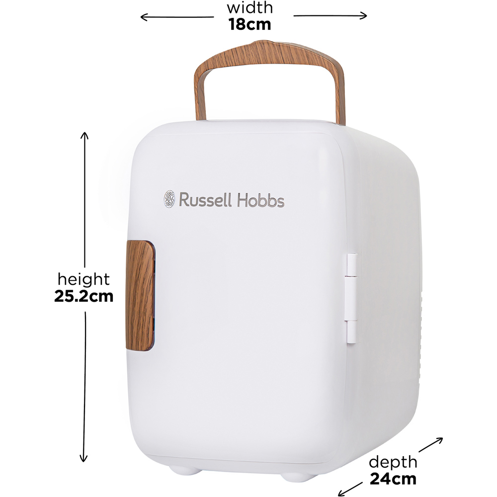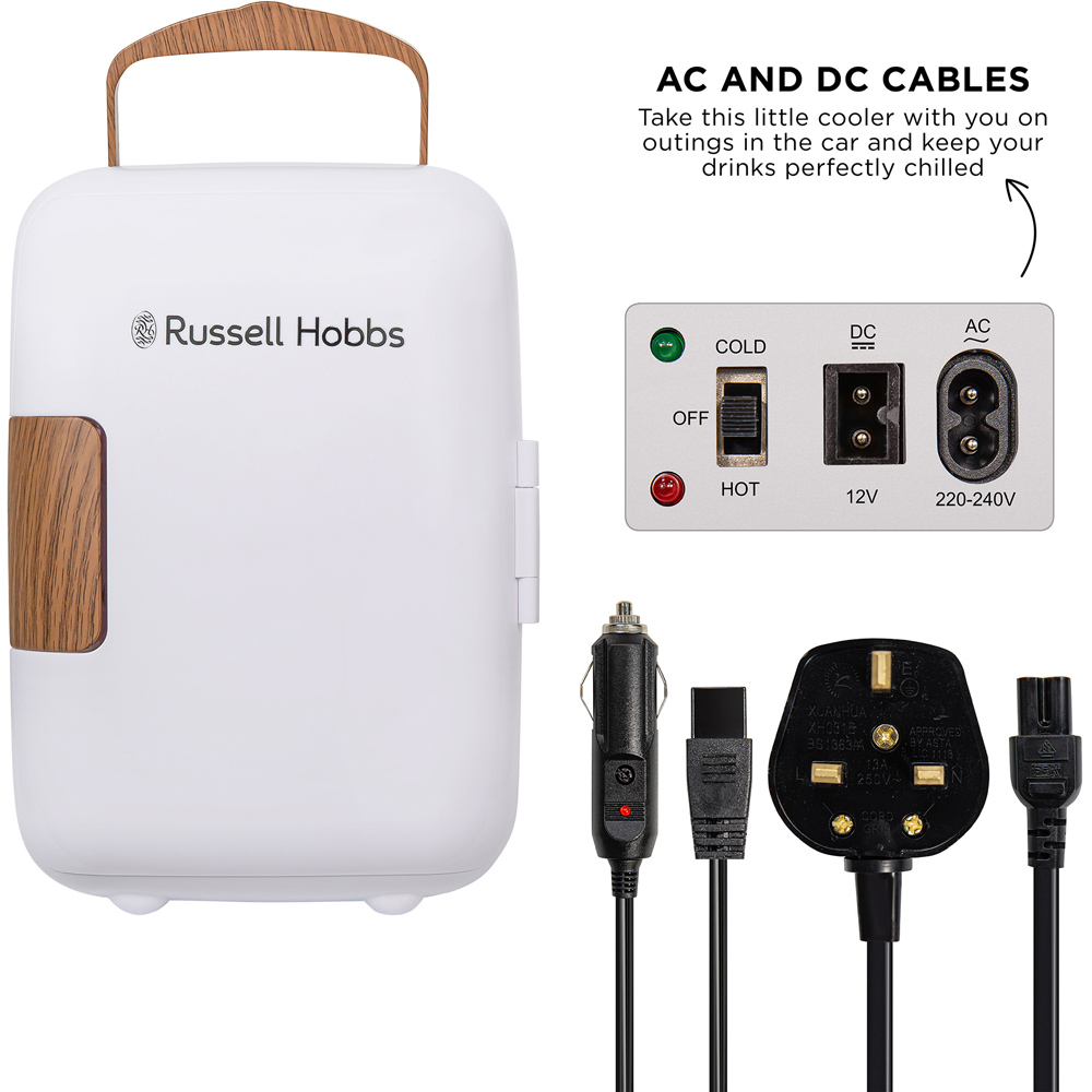 Keep your drinks and cosmetics safe with the Russell Hobbs RH4CLR1001SCW White and Wood Effect 4L Mini Cooler. This compact cooler with a classic design can be placed neatly in any interior space of your choice. This appliance has 4L space to fit six 330ml drink cans or a few of your favourite snacks. It is ideal for storing cosmetics, with a handy pocket on the inner door for your favourite face masks. The lightweight 2kg design with a door latch and a foldable carry handle makes this mini cooler highly portable for your convenience. It can also be used as a warmer - just heat up to 65°C with a quick flick of a switch to keep your pastries or paninis warm. It includes AC and DC car cables, which make this cooler perfect for camping, caravanning and family days out. This compact cooler comes with a one-year guarantee for added convenience.