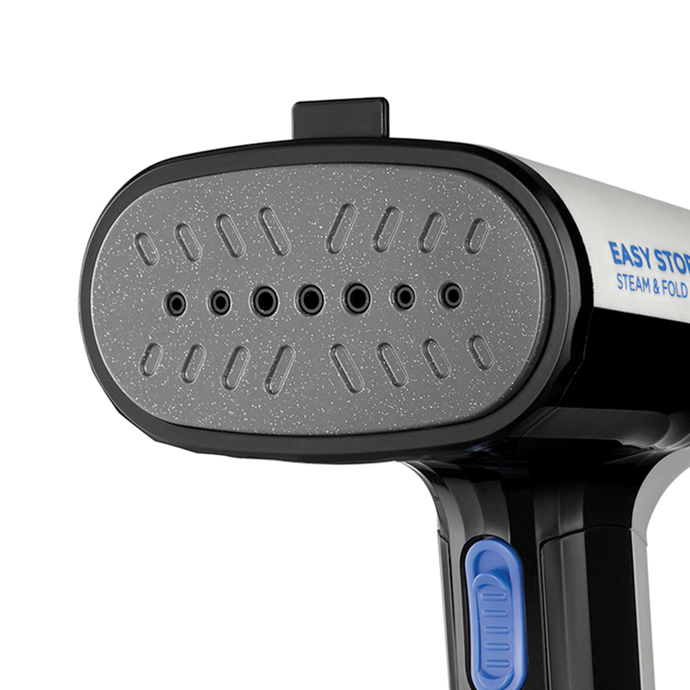 Experience the convenience and versatility of the Russell Hobbs Easy Store Hand-Held Steamer. Not only does it deliver the exceptional steaming performance you'd expect, but it's designed with storage in mind, ensures it doesn't take up too much cupboard space and is perfect for travels. With its quick 45-second heat-up time, you'll be ready to tackle your steaming tasks in no time. Also, this steamer is designed for hassle-free steaming directly on hangers or smoothing out creases in upholstery and bed linen. It has a powerful 20g steam output, efficiently eliminating 99.9% of bacteria and viruses on fabrics and hard surfaces in just 60 seconds*. Plus, when you're done, the intelligent design allows you to conveniently fold the steamer in half. The cord neatly wraps around the back of the steamer and clips into place for easy storage. Power: 1700W.