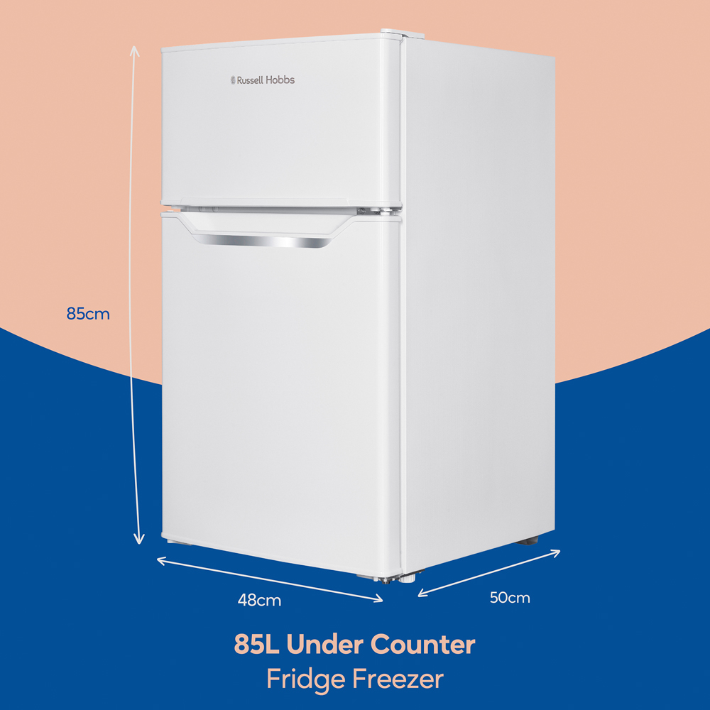 This Russell Hobbs Under-Counter Fridge Freezer is the perfect addition to your kitchen or utility room and can be used as your main fridge-freezer or as additional storage to free up some space in your kitchen. There’s 61L of fridge space to easily fit up to three bags of food shopping, whilst the freezer space offers 24L of room for frozen meals and treats. At only 48cm wide, this slimline undercounter fridge freezer is designed to slot seamlessly into smaller spaces. The fridge space features two handy glass shelves, which can easily be removed if you ever need space for larger items. The two additional fixed door racks are ideal for taller drinks cartons and bottles. Built with functionality in mind, this model features an E energy rating, helping to keep running costs and your carbon footprint to a minimum. Not only that but this fridge freezer has the addition of an adjustable thermostat, so you can precisely set the temperature to suit the contents inside. There’s also a reversible door for versatility, so you can place your fridge freezer wherever you want it in your kitchen or utility room. Plus, there are adjustable feet to ensure your fridge is stable on uneven surfaces. For added peace of mind, this Russell Hobbs Fridge Freezer comes with a 2-Year Guarantee upon registration. This way, in the unlikely event something goes wrong, you know we'll always be on hand to help.