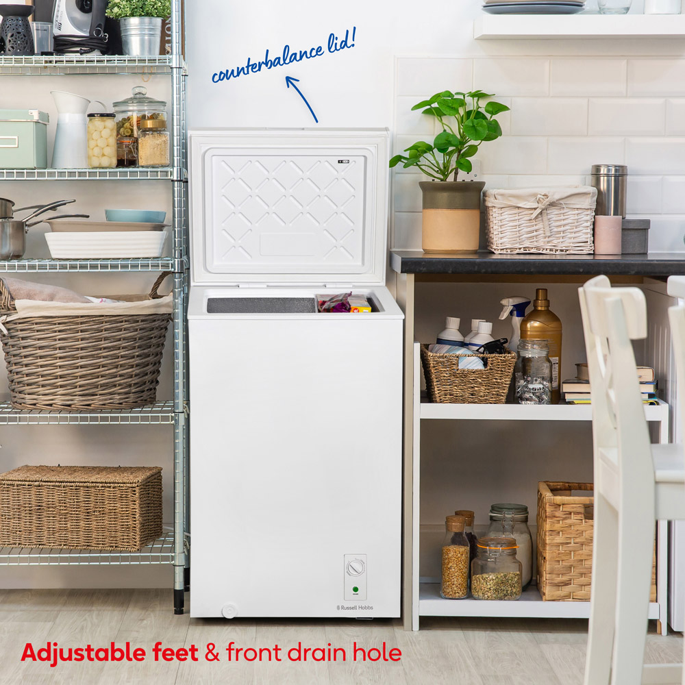 This Russell Hobbs compact chest freezer is perfect if you need extra freezer space, but short on space in your home. With an impressive 99L of storage, you can easily free up some room in your main freezer. This freezer is suitable for your garage, outhouse or shed, keeping it out of your main kitchen space. Thanks to the spacious interior with a handy basket, this freezer can fit five bags of shopping. Keep your family's favourite batch-cooked meals and frozen treats handy without worrying about running out of room. Plus, with the handy chill or freeze function you can effortlessly switch to chill mode if you need the space to keep your extra drinks or snacks cool. For added peace of mind, this Russell Hobbs chest freezer comes with a 1-Year Guarantee, plus an extra 4 years upon registration. This way, in the unlikely event something goes wrong, you know we'll always be on hand to help.