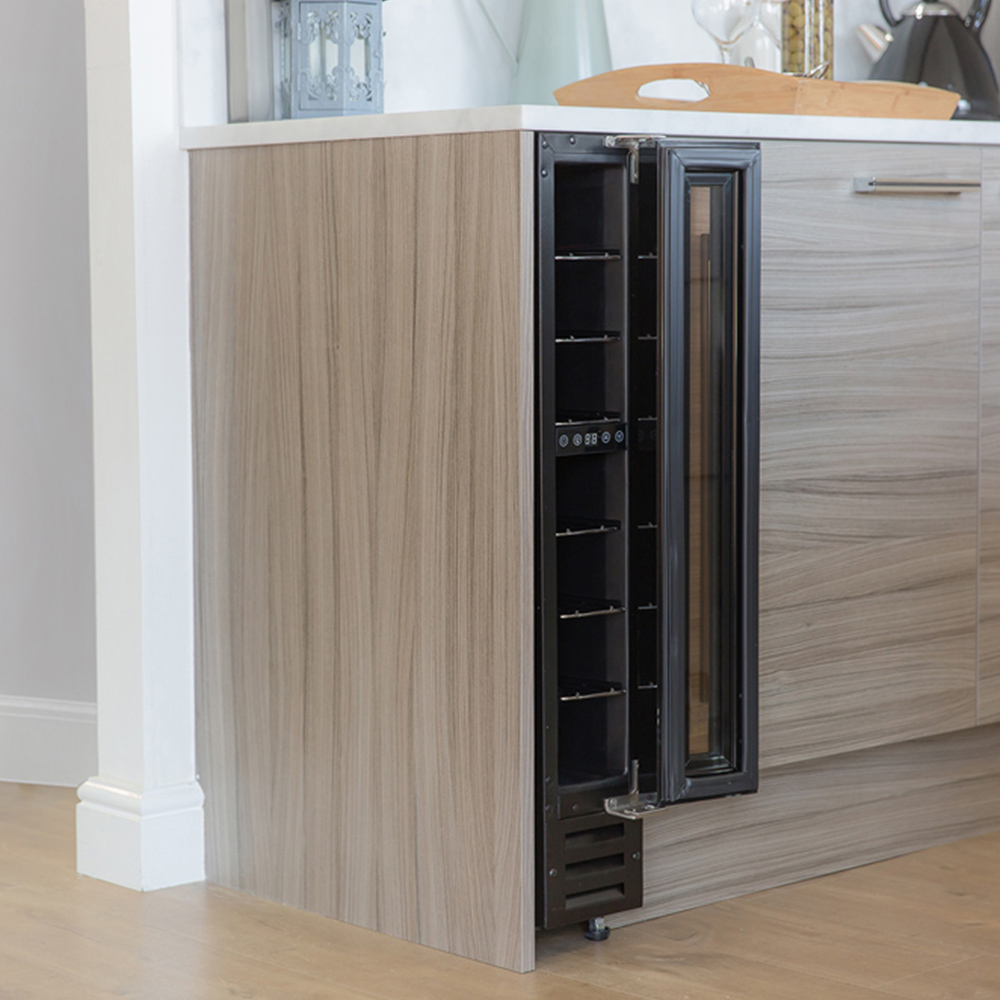 Bring home the classic Russell Hobbs RHBI7WC1 Black Glass 22L Wine Cooler. This built-in wine cooler allows you to store up to seven wine bottles. It has six chrome shelves to store one bottle per shelf and keep them safe. This black glass cooler has a B-grade energy efficiency rating and LED display, saving your energy costs. It has a temperature range from 5° - 18° and an LED temperature control. It helps you set the desired temperature to keep your wine bottles the way you like. This versatile wine cooler has a low 39dB(A) noise production. This freestanding cooler complements your kitchen interior.