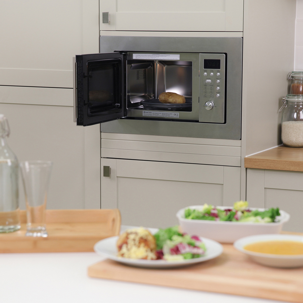 The Russell Hobbs RHBM2001 Silver 20L Stainless Steel Digital Microwave 800W is both practical and stylish, with a classic stainless steel and mirrored door design it will fit beautifully into your kitchen. It Complements your other kitchen appliances and fitting seamlessly into your kitchen units. This built-in microwave is simple and easy to use with its 800 watts of microwave power, providing quick and convenient cooking at home. With a 20L capacity this appliance can comfortably fit a standard sized dinner plate and comes with a removable and dishwasher safe glass turn-table for easy cleaning. Pre-programmed auto cook menus, such as pizza (reheat), fish, and popcorn, allow you to cook all your favourite foods at the push of a button. There is automatic defrost settings meaning all you have to do is input the weight of the food, and the microwave selects the ideal defrost time, saving you time and effort. Boasting 5 microwave power levels it’s easy to tailor cooking experience. Additional features include a handy digital clock and count-down timer, and for added peace of mind, it comes with a child safety lock option. Once the child lock is on, it locks the button control so the microwave cannot be activated. Note: It is designed to fit a kitchen unit opening of 36.2cm high, 56cm wide and 32cm deep, and should be installed by a suitably qualified person. Size: 38.2 x 59.5 x 34.3cm.