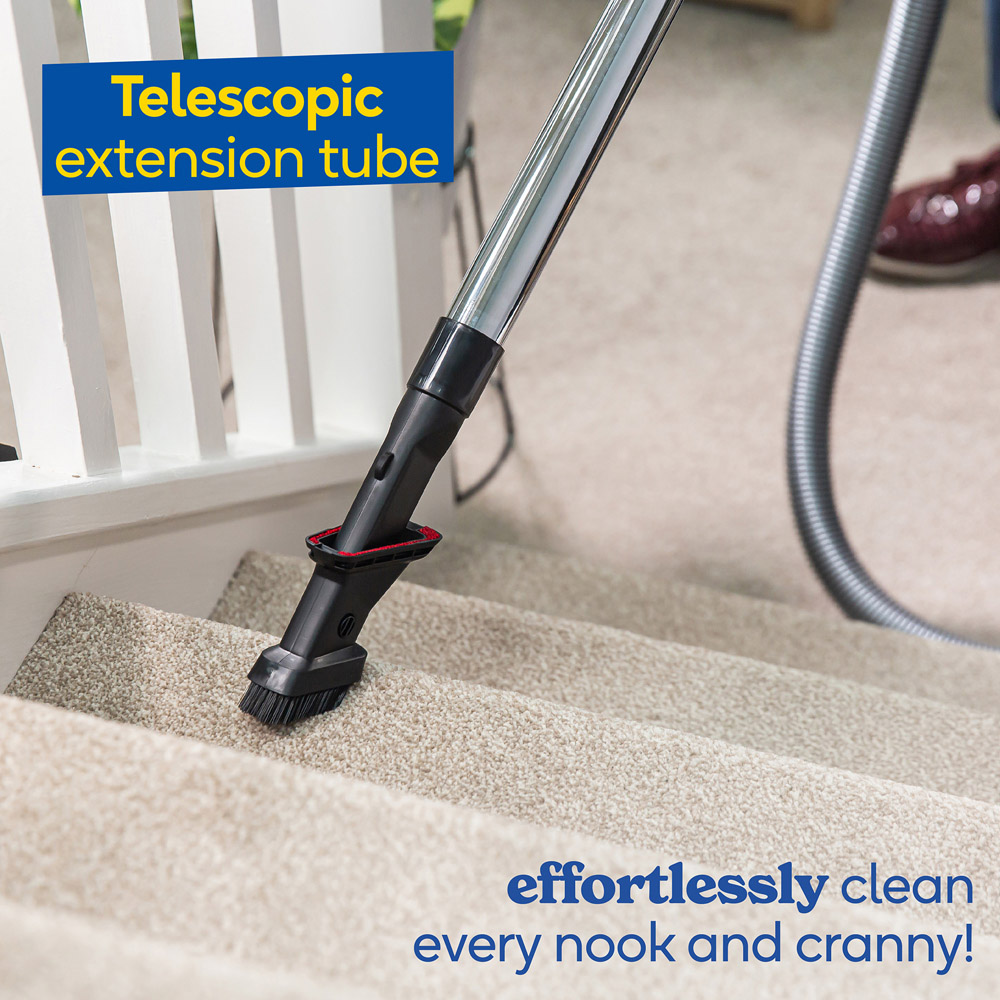 Discover efficient cleaning with the Russell Hobbs RHCV1611 Compact XS Cylinder Vacuum. Despite its compact footprint, this cylinder vacuum packs a punch with a generous 1.5L dust capacity, ensuring efficient cleaning sessions. Equipped with a high-efficiency 700W motor, it delivers a powerful suction. Its Triple Dust-Lock filtration system effectively traps allergens and dust within the unit, making it ideal for allergy sufferers. Equipped with a 3-in-1 multi-tool, it allows you to remove dust and dirt from every nook and cranny of your cushions and sofa. With an impressive eight-meter cleaning radius and a 5-meter retractable power cord, it allows you to cover a larger area. For added peace of mind, it comes with a one-year guarantee, plus an extra year upon registration.