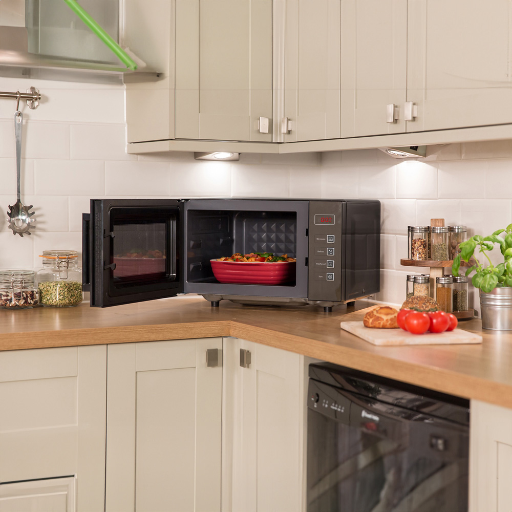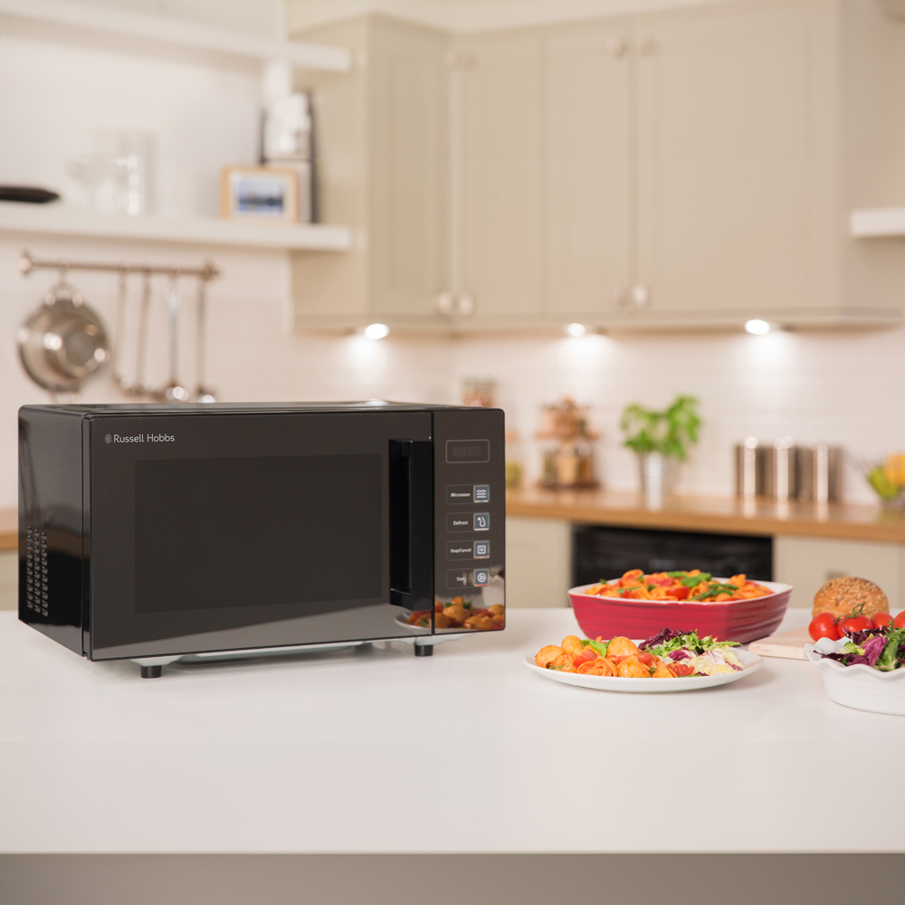 Sleek and stylish, the Russell Hobbs RHEM2301B Easi Flatbed Digital Microwave in black will complement any modern kitchen with its contemporary design. Boasting an attractive mirror door finish, this microwave functions simply and instinctively, with four simple buttons that allow you to microwave, defrost, start and stop or cancel. No complicated auto-cook menus or power levels make for easy use. It features innovative Flatbed technology, which removes the need for a turntable to offer a microwave with more useable space. Square plates and casserole dishes that would not fit in a conventional turntable microwave, can be reheated or defrosted with ease. The flatbed surface is easier to clean than a conventional microwave, so food debris and moisture can be easily wiped away. The diamond cavity structure provides improved microwave distribution by enhancing the reflection of the microwaves inside the cavity, resulting in improved cooking performance. This helps to cook your food more effectively, saving time and energy.