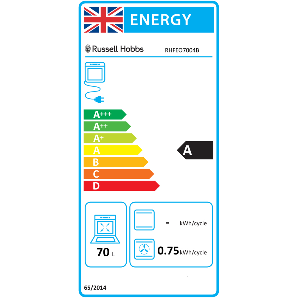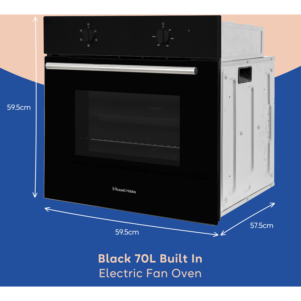 This Russell Hobbs Built-In Electric Fan Oven has a sleek design that will complement any kitchen. The single cavity with an impressive 70L capacity and five oven functions make this oven perfect for all your family's cooking needs. Offering full flexibility you can choose from convection heating, eco, grill with fan, grill only and even a defrost function. The handy eco mode saves energy as the fan distributes the heated air around the food from the top and rear heating elements. With the two shelves, you can effortlessly cook a variety of meals at once plus, the dials are super easy to use. The oven light means that you can check on the progress of your cooking without opening the oven door and even better, the easy clean interior will keep your oven looking newer for longer. For added peace of mind, this Russell Hobbs Electric Oven comes with a 1-year guarantee with a free second year guarantee upon registration.