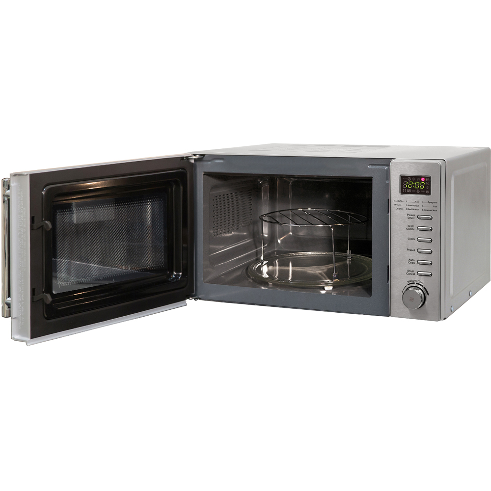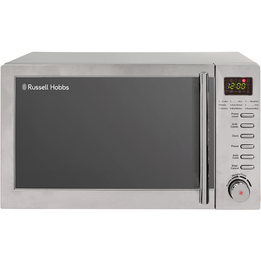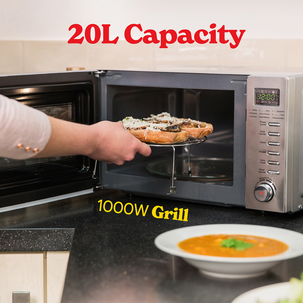 Make a functional addition to your kitchen with Russell Hobbs RHM2031 Digital 20L Microwave. It features 800W power with a 1000W grill and eight adjustable auto-cook settings for your convenience. It also has 5 power levels with a defrost setting and a handy digital clock with a countdown timer. All you must do is input the food's weight, and the microwave selects the ideal defrost time. It has a removable glass turntable that is dishwasher safe with pre-programmed auto-cook menus for cooking your favourite meals. This microwave also comes with a child safety lock option. Once the child safety lock is on, it locks the button control, and the microwave cannot be activated.