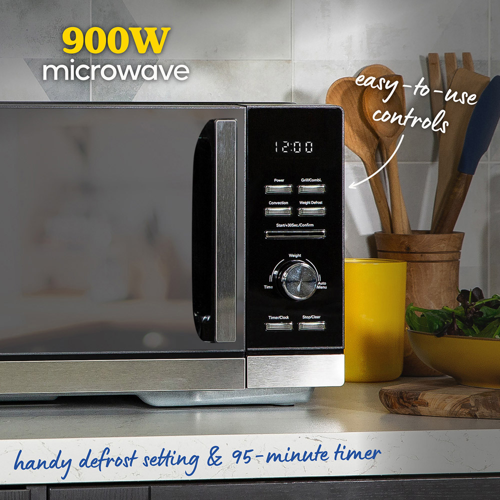 Make a perfect addition to your kitchen by adding the Russell Hobbs RHM2501B Black 25L Digital Combination Microwave 900W. With its sleek mirror door finish, this microwave not only looks stylish but also offers incredible functionality with easy-to-use features. The generous 25L capacity is ideal for families and households of all sizes, comfortably fitting an 11.5inch round plate. Offering 900W of power and five power levels, this microwave cooks your food quickly and efficiently. The powerful 2100W convection oven and 1000W grill make it effortless to heat, roast, crisp and brown your meals to perfection. The 10 auto-cook settings simplify the cooking process, allowing you to prepare dishes like pasta, pizza, meats, and fish with just the touch of button. The button controls and a 95-minute timer are simple and intuitive, giving you full control from microwave to plate without hassle. The defrost setting is perfect for quickly thawing frozen food, making meal preparation easy even when you are busy with work or errands. For added peace of mind, this microwave comes with a one-year guarantee.