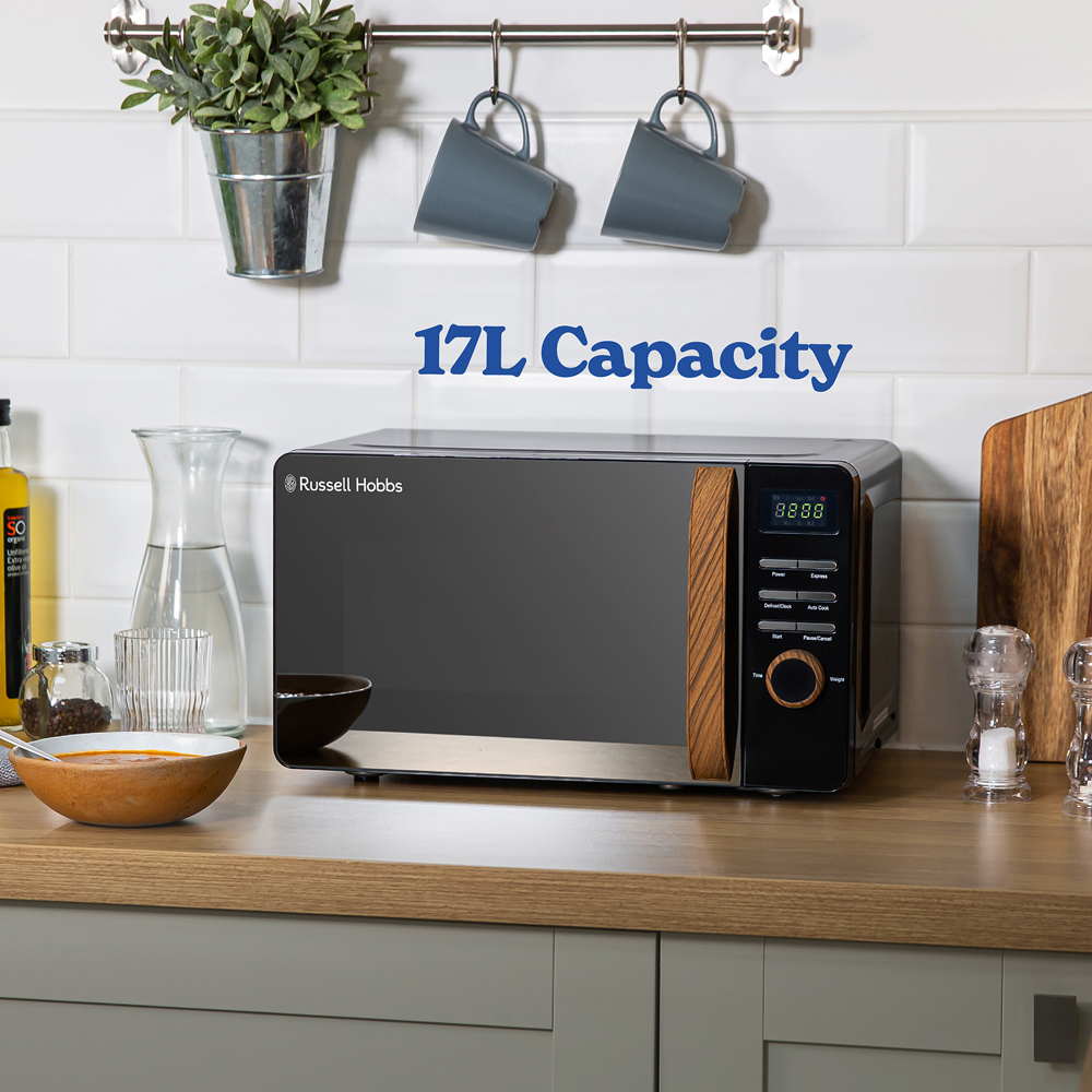 Introducing the Russell Hobbs RHMD714B-MN Black 17L Scandi Compact Digital Microwave 700W, a stylish and functional addition to any kitchen. Inspired by the clean lines and natural textures of Scandinavian design, this 700W microwave combines wood effect accents with a sleek body to bring a chic and sophisticated look to your kitchen. Perfect for kitchens with limited space, this microwave features a 17L capacity, comfortably fitting a round dinner plate up to 10.5 inch(26.5cm). With 700W of power, this microwave ensures quick and convenient cooking. It comes with eight auto-cook menus, allowing you to cook popular dishes like popcorn, pizza, potatoes, and fish with ease. Its multi-sequence function allows you to cook one dish at different power levels. The defrost setting saves you time by letting you heat meals straight from the freezer. A handy beeper alerts you when the cooking cycle is complete, making meal preparation even simpler. For added peace of mind, it includes a one-year guarantee.