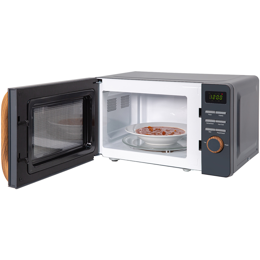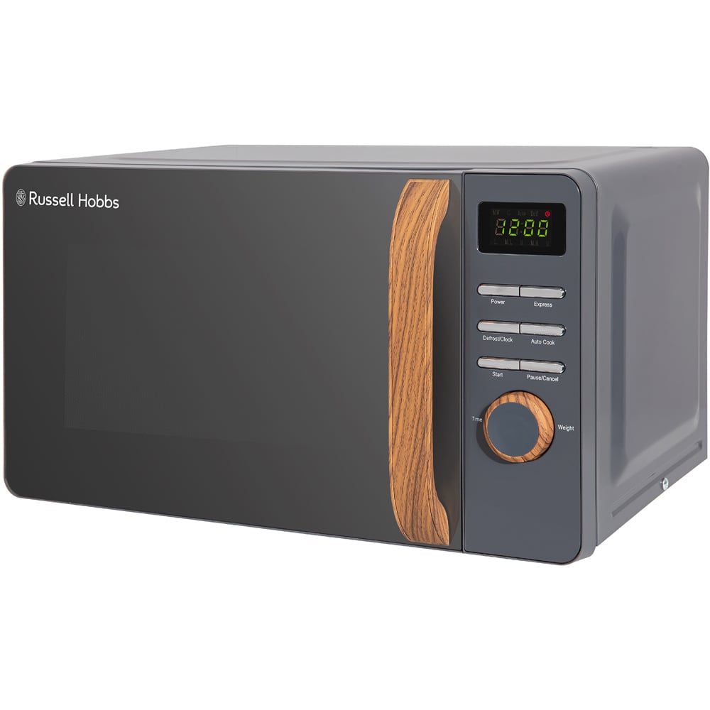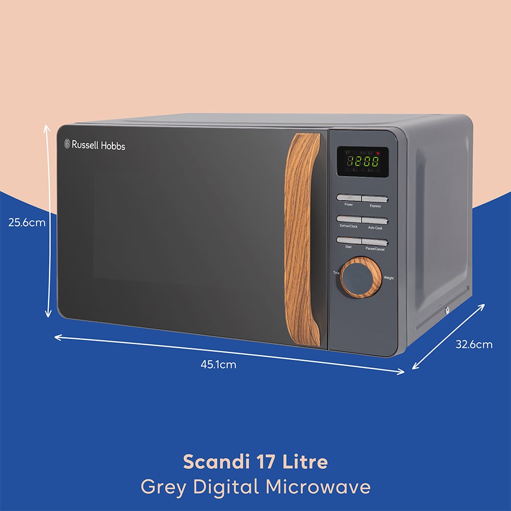 Introducing the Russell Hobbs RHMD714G-MN Grey 17L Scandi Compact Digital Microwave 700W, a stylish and functional addition to any kitchen. Inspired by the clean lines and natural textures of Scandinavian design, this 700W microwave combines wood effect accents with a sleek body to bring a chic and sophisticated look to your kitchen. Perfect for kitchens with limited space, this microwave features a 17L capacity, comfortably fitting a round dinner plate up to 10.5 inch(26.5cm). With 700W of power, this microwave ensures quick and convenient cooking. It comes with eight auto-cook menus, allowing you to cook popular dishes like popcorn, pizza, potatoes, and fish with ease. Its multi-sequence function allows you to cook one dish at different power levels. The defrost setting saves you time by letting you heat meals straight from the freezer. A handy beeper alerts you when the cooking cycle is complete, making meal preparation even simpler. For added peace of mind, it includes a one-year guarantee.