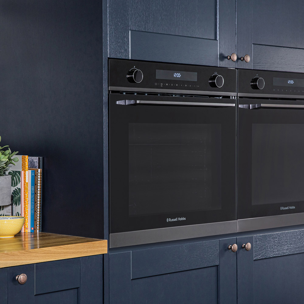 This premium product range features sleek, stylish appliances with black and dark steel accents. The versatile RHMEO7202DS acts as a microwave or fan oven, giving you ultimate cooking freedom. The large 72L interior means you can prepare multiple dishes at once and still have space left to play with. This integrated appliance comes with two shelves and a full-width grill pan, so you can cook over multiple levels. When operating as a microwave, this models offers 800W of power, as well as 13 autocook menus and five power levels. The RHMEO7201DS features 13 oven functions and a range of settings, so you can master every recipe. Programmes include fan heating, double grill, single grill, grill with fan, microwave and microwave with convection. This electric oven features Intelligent Air Technology, offering an even temperature throughout for consistent cooking. Not only does this reduce cooking times, it also allows you to cook at lower temperatures with the same great results. Cleaning your oven is never fun, which is why we've made this oven's interior with easy-clean enamel, designed to be tough and durable. With a smooth, resistant coating, cleaning is fuss-free and your oven looks newer for longer. Easier cleaning means you can spend more time cooking and less time scrubbing. The RHEO7201DS also features a quadruple-glazed glass door, designed to keep the heat in your oven and the outer glass cool to the touch. This not only decreases the temperature of the oven door, but also reduces the time it takes for your oven to heat up. Cook up the right recipe for your utility bills and the environment, with the Russell Hobbs RHMEO7201DS. This oven has an A+ energy efficiency rating, so you can cook without worrying about costs or your carbon footprint. It also offers you an energy-saving Eco function when cooking, meaning you get the same great results at a lower cost. This product also comes with an impressive three year guarantee upon registration, for that added peace of mind.