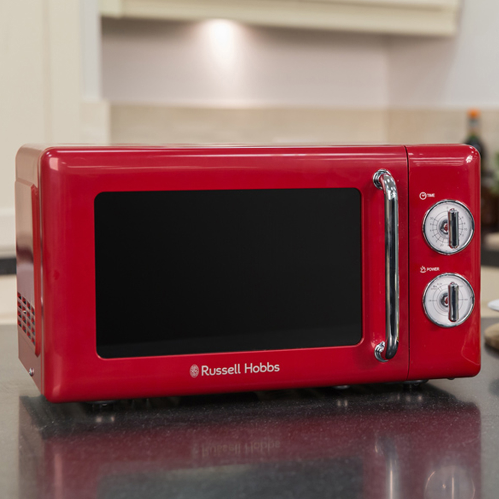 Add a sophisticated retro vibe to your kitchen with the Russell Hobbs RHRETMM705R-N Retro Red 17L Compact Manual Microwave 700W. This sleek, classic appliance is bound to make a statement with its smooth curves, streamlined chrome handles, and glossy red finish. The microwave boasts a 17L capacity and 700W of power, making it ideal for quick and convenient cooking at home. Key features include five microwave power levels and a defrost setting, allowing you to tailor the cooking to suit your recipe. Simply turn the power dial to select your desired level. The microwave fits a round dinner plate up to 10.5 inches(26.5cm) and is easy to use. It comes with a one-year guarantee.