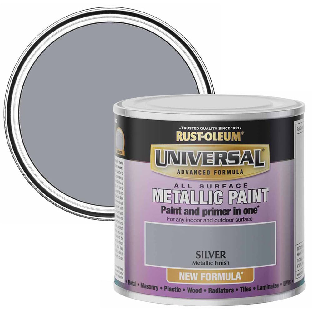 Paint tricky interior and exterior surfaces easily with Rust-Oleum Universal Metallic Silver 250ml. With both paint and primer in one - Universal can be applied directly to a wide range of surfaces, including UPVC, wood, metal, plastics, ceramic and more. With the paint being heat resistant - it can instantly transform shabby radiators in just two simple coats. Made with durable formula - it is fade and chip resistant.