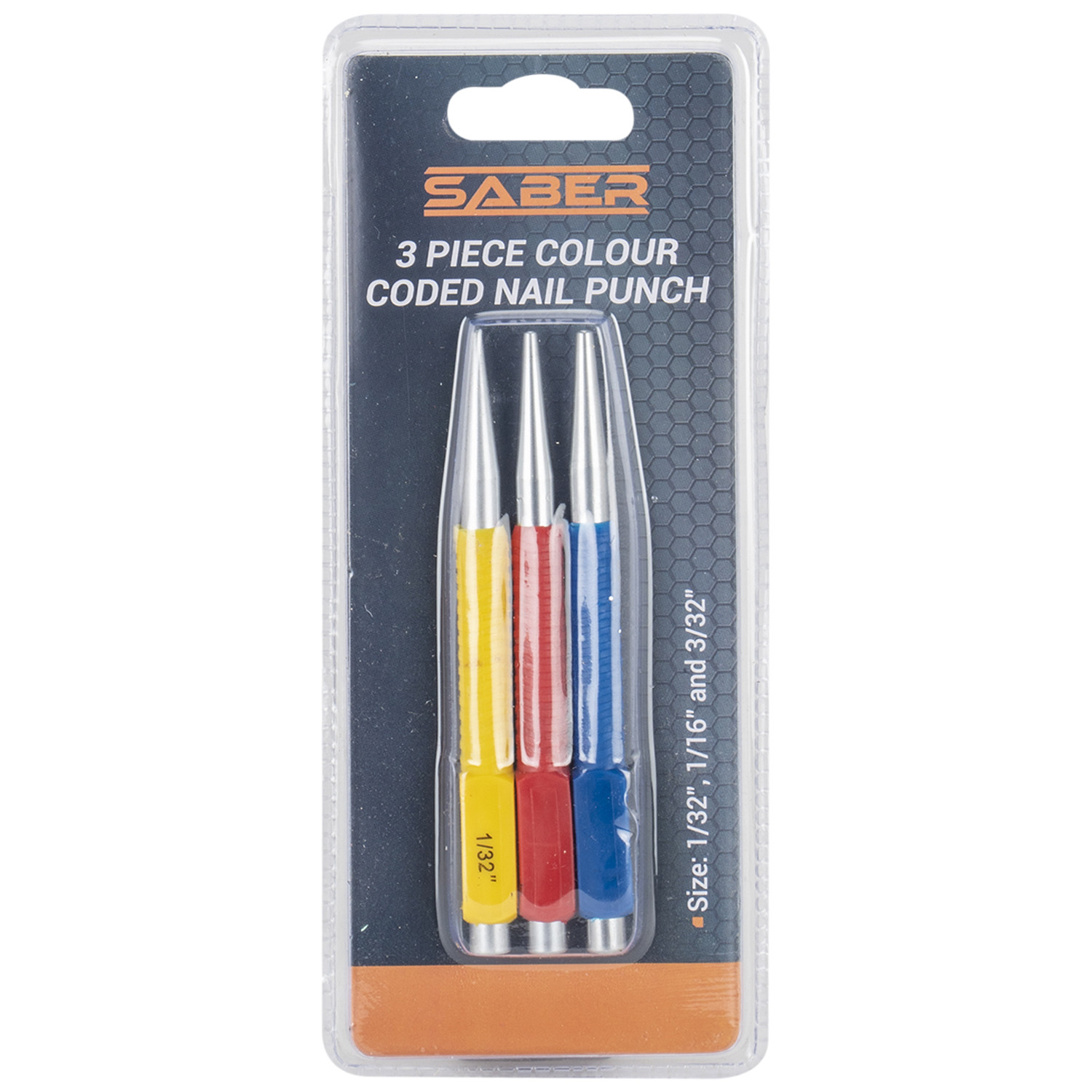 The Colour Coded Nail Punch Set from Saber is an essential set of tools for any handyman who wants precision in his work. Helping you to create pilot holes before hammering or screwing into a variety of materials, the heat-treated steel will punch through leather, wood, thin to medium metal, and more. With three sizes that are colour coded for your convenience, these nail punches will be easy to identify as well as to use.