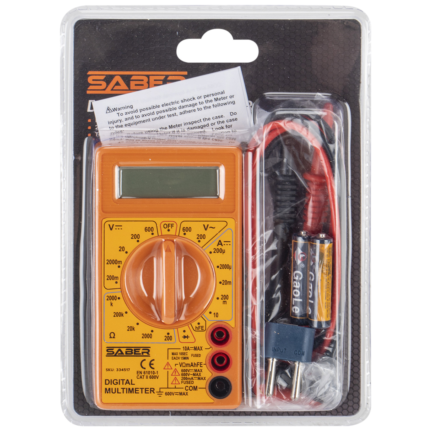 Measure AC/DC voltages with high precision using this Digital Multi Tester, Essential for carrying out electrical work, this VOM tester is made with 20 position function and range selector. The easy to read digital display will ensure a perfect reading, giving you security in-accuracy, With test probes, leads, and batteries included, this Digital Multi Tester from Saber is the ideal choice for any professional technician or home handyman.