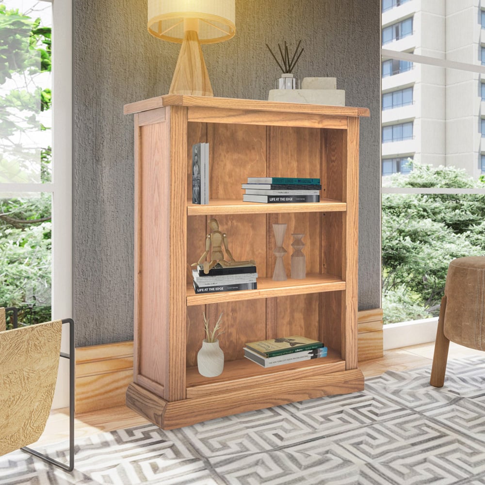 Simple but pleasing in design, this Salerno 3 Shelf Light Wood Lacquered Bookcase is perfect for infusing natural style into your decor. Crafted by skilled craftsmen to the highest standards using responsibly sourced wood and veneers, so rest assured it'll last season after season. It is made using a combination of solid hardwood and veneers and is carefully hand-finished in a natural colour using a high-quality, eco-friendly, water-based lacquer. This stylish low and narrow bookcase is ideal for storing and organising your collection of books or perhaps CDs or DVDs over three shelves. The two central shelves are adjustable to tailor the space to suit your requirements. The top is ideal for displaying a favourite photograph or a houseplant. These attributes, combined with a simple construction for easy assembly, make it a great product for any household. Dimensions: 90 x 70 x 25cm.