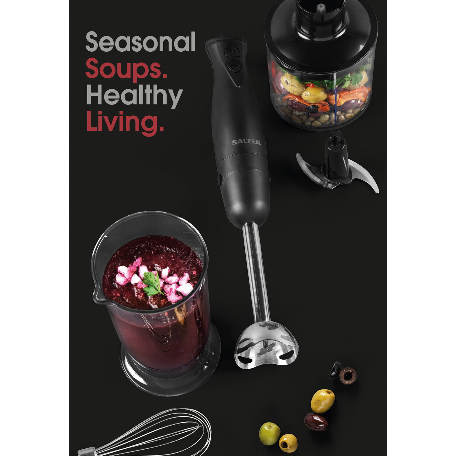 Blend, whip, and chop conveniently using this Salter Kuro 3 in 1 Blender Set. Equipped with stainless steel blades, this blender offers a precise performance. It features two-speed settings so you can effortlessly make healthy soups, bruschetta, fresh meringue and more. Practical and efficient, this BPA-free blender comes with a 500ml chopping bowl and a 700ml storage beaker, making it a great kitchen accessory ideal for any home.
