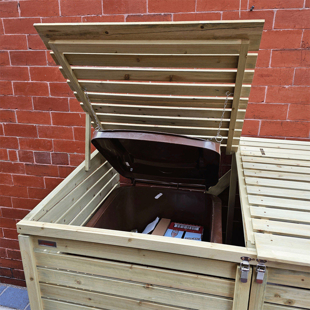 Keep your garden clean by storing your dustbins with this Large Wooden Outdoor Wheelie Bin Store Storage by Samuel Alexander. This double bin store is designed to neatly hide away and cover up to two standard-size wheelie bins with practical top-hinged lids and side-hinged front doors for easy access. The top-hinged lids include a securing chain attached to the bin lids, allowing the lid to open when you lift the storage lid. The chain is attached by threading it through the handle of the bin lid and then attaching it to the store lid, which can be easily removed when it's bin day. The natural wooden frame can complement any garden and outdoor setting, with the slatted design helping to promote airflow and maintain a clean area. The wood is ACQ-treated for durability and longevity. External dimensions: 134cm wide, 122cm high at the back, 114cm at the front. The load space is 62.5cm wide, 109.5cm high, and 79cm front to back, and it takes up to a 240-litre bin.
