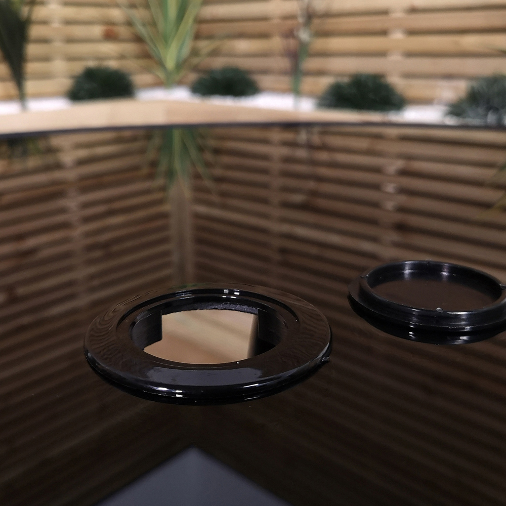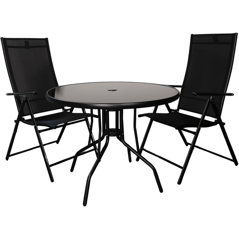Enjoy summer leisure time with this attractive Outdoor Recliner Dining Set by Cheaper Online. This stunning set can become the focal point of your garden, terrace or patio area, making it ideal for dining or enjoying drinks in the summer. It has space for up to four seats. This garden table set is excellent for going outdoors and unwinding with family or friends. It creates an inviting space whilst maximizing your enjoyment of the garden. With its sleek and contemporary design, it can complement any garden setting and furniture. This modern tabletop has a round-shaped black tempered glass top with four sturdy legs and two matching chairs featuring black textile material. The frame of the table and chair legs are made from steel and finished with a black powder coating, making it solid and durable. Choose from nine positions to recline by adjusting the seat handles to sit back and unwind. No assembly is required for the chairs; they unfold and can be used immediately, and they easily fold back up for convenient storage. The set is supplied flat-packed, and self-assembly is required with instructions included. Table dimensions: Tabletop Diameter 90cm, Table top thickness: four cm, Table Height 70cm, Leg thickness three cm, Parasol hole Diameter five cm, Chair Dimensions H43cm x W44cm x D41cm, Backrest Height 65cm, Armrest Length 43cm, Total Height 107cm, Total Width 56cm. Max user weight 110kg. Protect your garden furniture with our durable and waterproof covers. Explore our wide range of heavy-duty