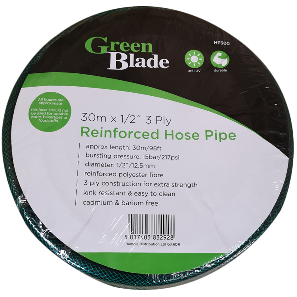 Make a functional addition to your gardening tools with the Samuel Alexander 30m Green Reinforced Garden Hosepipe. This reinforced, polyester fibre hose features a kink-resistant outer covering with a three-layer construction. This 30m garden hose has a 15 bar PSI with 12.5mm diameter. It is a multipurpose hose that offers flexibility while in use and has a durable structure ideal for long-term usage. Please note: It should not be used for potable water, beverages or foodstuffs.