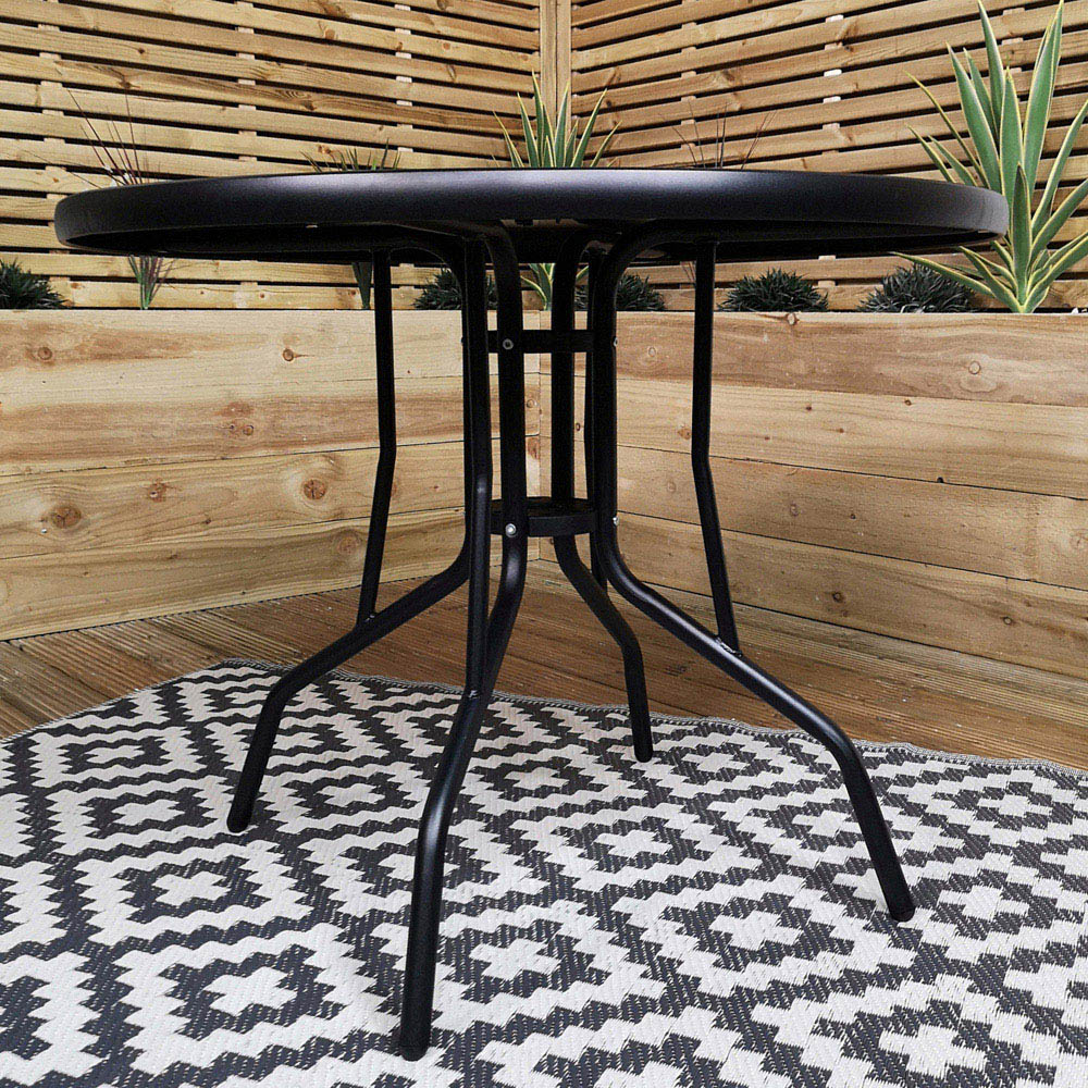 Enjoy summer leisure time with this attractive Outdoor Dining Set by Cheaper Online. This stunning set can become the focal point of your garden, terrace or patio area, making it ideal for dining or enjoying drinks in the summer. It has space for up to four seats. This garden table set is excellent for going outdoors and unwinding with family or friends. It creates an inviting space whilst maximizing your enjoyment of the garden. With its sleek and contemporary design, it can complement any garden setting and furniture. This modern tabletop has a round-shaped black tempered glass top with four sturdy legs and four matching chairs featuring black textile material. The frame of the table and chair legs are made from steel and finished with a black powder coating making this strong and durable. In the centre of the table features a parasol hole with a diameter of five cm. When not in use the chairs are easily stackable, allowing for easy and convenient storage for when space is limited. Included with this table and four chairs set is a cream parasol and parasol base allowing you relax and enjoy the outdoors with the benefit of shade. The parasol features a crank handle to open and close the umbrella with a tilt function activated by the touch of a button. The parasol base also features a rose design with a cast iron effect and includes removable collars and a tightening knob. The set is supplied flat-packed, and self-assembly is required with instructions included. Table dimensions: Tabletop Diameter 90cm, Table top thickness: 4cm, Table Height 70cm, Leg thickness 3cm, Parasol hole Diameter 5cm, Chair Dimensions H43cm x W44cm x D41cm, Backrest Height 65cm, Armrest Length 43cm, Total Height 107cm, Total Width 56cm. Max user weight 110kg, Parasol Dimensions: Height 2.25m, Diameter: 2m, Pole Diameter: 32mm, Parasol Base Dimensions: Height from ground 35cm (including pole), Diameter 45cm Base weight 9kg. Protect your garden furniture with our durable and waterproof covers. Explore our wide range of heavy-duty