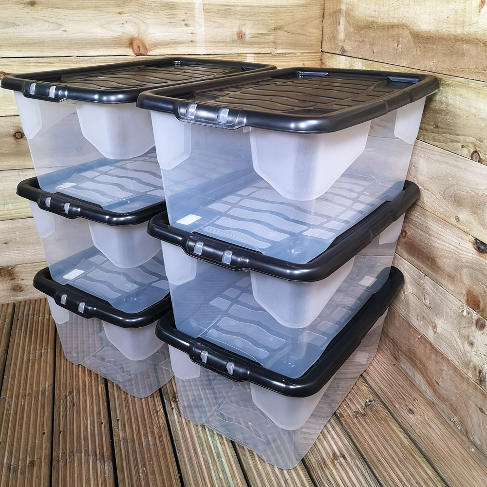 Pack of 6 x 42l Storage Boxes, the perfect storage solution for maximising space in your home. With its clear design, you'll be able to easily see what's inside without having to rummage through the contents. The black lid creates a sleek, modern look that will complement any decor. Made from durable, high-quality plastic, these storage boxes are stackable and nestable, allowing you to maximise space and keep your things organised and easy to access. Each measuring 60cm long, 39cm wide, and 26cm deep, they're the perfect size for storing shoes, clothing, bedding, and other items that you want to keep out of the way. Its compact design makes it easy to fit under the bed, Its compact design makes it great for most uses; it's a great way to save floor space and keep your room looking neat and tidy! The lid is indented to securely stack as many as you like, too!