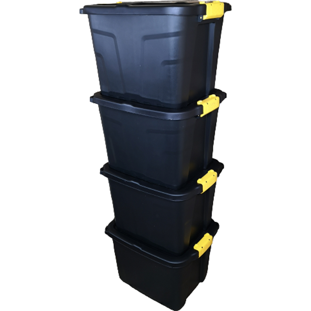 Pack of 4 heavy-duty storage tubs. Made from super durable, strong plastic, and each is equipped with 2 yellow clip handles to secure the lid. With a 60l capacity, they're perfect for organising and storing a variety of items. The trunks have a stackable design, making it easy to store in a variety of locations. The lid is also lockable, giving you added security for your items. The design of the storage chest is nestable, so when it's not in use, you can easily store it in a compact space. These storage boxes measure 34cm in height, 50cm in length, and 38cm in width, making them a versatile storage solution for any space. Whether you need to store seasonal decorations, sports equipment, or other household items, these storage tubs are up to the task!