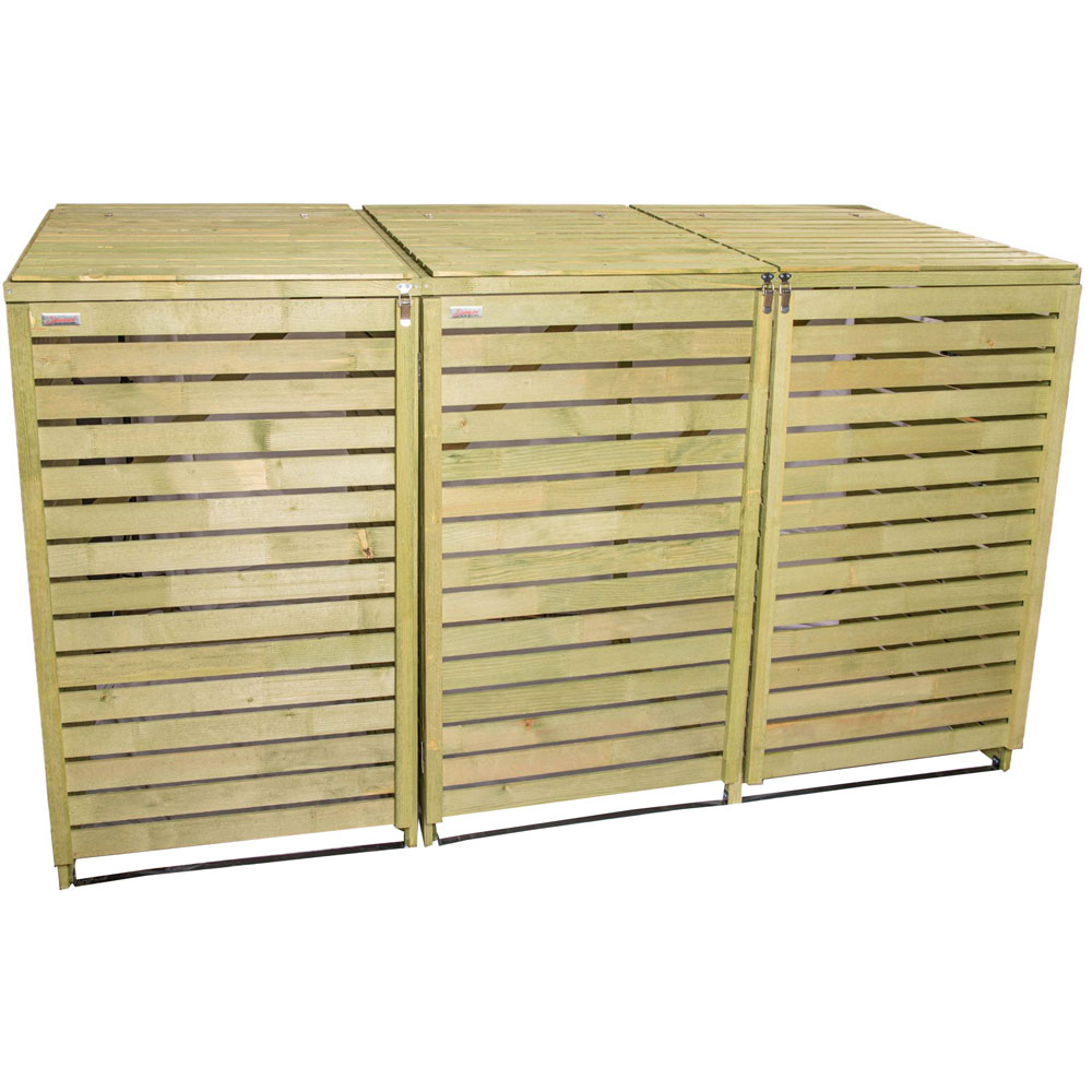 Relax and enjoy your outdoor leisure time in the garden this year without the unpleasant sight of your wheelie bins. This triple bin store is a set consisting of a double bin store unit and a separate single unit designed to neatly hide away and cover up three standard-sized wheelie bins. With a practical top-hinged lid and side-hinged front door for easy access. The top-hinged lid includes a securing chain that can be attached to the bin lid, allowing the lid off the bin to open when you lift the storage lid. The chain is attached by threading it through the handle of the bin lid and then attaching it to the store lid, and can be easily removed when it's bin day. The natural wooden frame will complement any garden and outdoor setting, and the slatted design helps promote air flow and maintain a clean area. The wood is ACQ-treated for durability and longevity. Supplied flat-packed, and self-assembly is required. Please note this is a double bin store unit and a separate single unit to provide a triple storage unit, and due to the hinge placements, the units cannot be attached. External dimensions: 2.02m wide, 122cm high at the back, 114cm at the front. Load space 62.5cm wide, 109.5cm high, 79cm front to back and takes up to 3 x 240 litre bins.