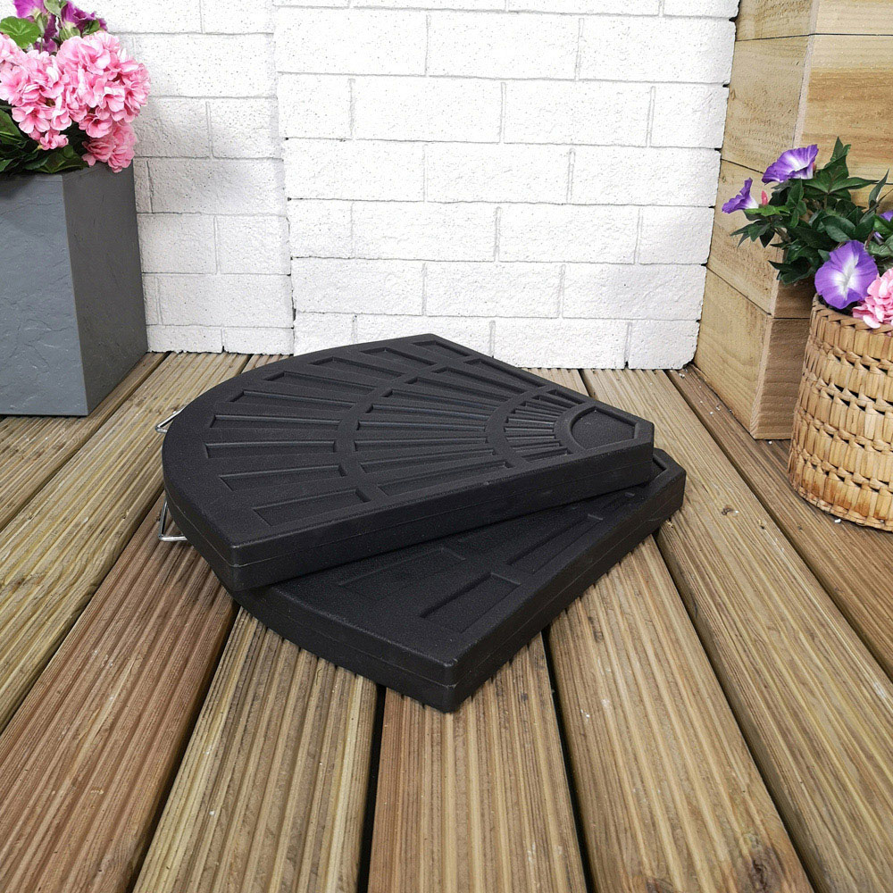 Relax in your garden by adding stability to your hanging parasol umbrella with this Parasol Base Weight by Samuel Alexander. This black-coloured sectional piece is shaped to hold the cross stand into place, keeping your parasol safe and stable on those windy days. Made from tough Resin, it will not rust and doesn't need to be filled with sand or water. This weight features a rugged Black finish with a ribbed pattern. Each weight has a metal handle that can be pulled out for easy carrying and placement. The set comes features two parasol base weighs around 14 kg each. It also includes metal handles that can be pulled out for easy carrying. Dimensions H four cm x W45cm x L45cm.