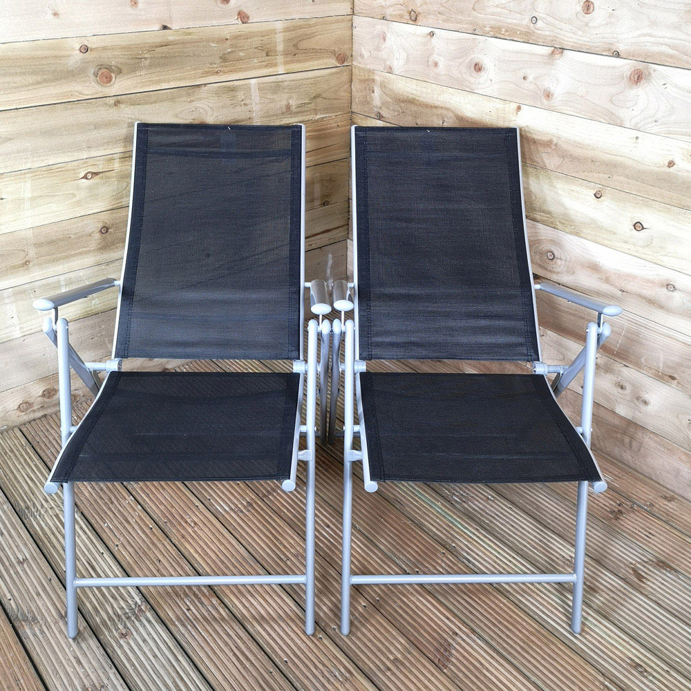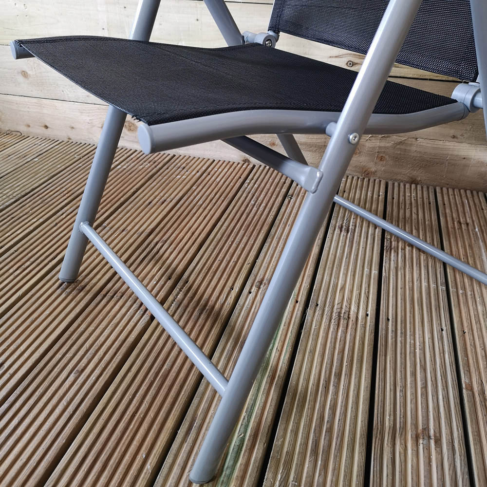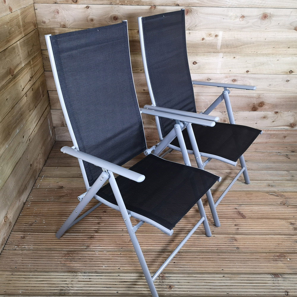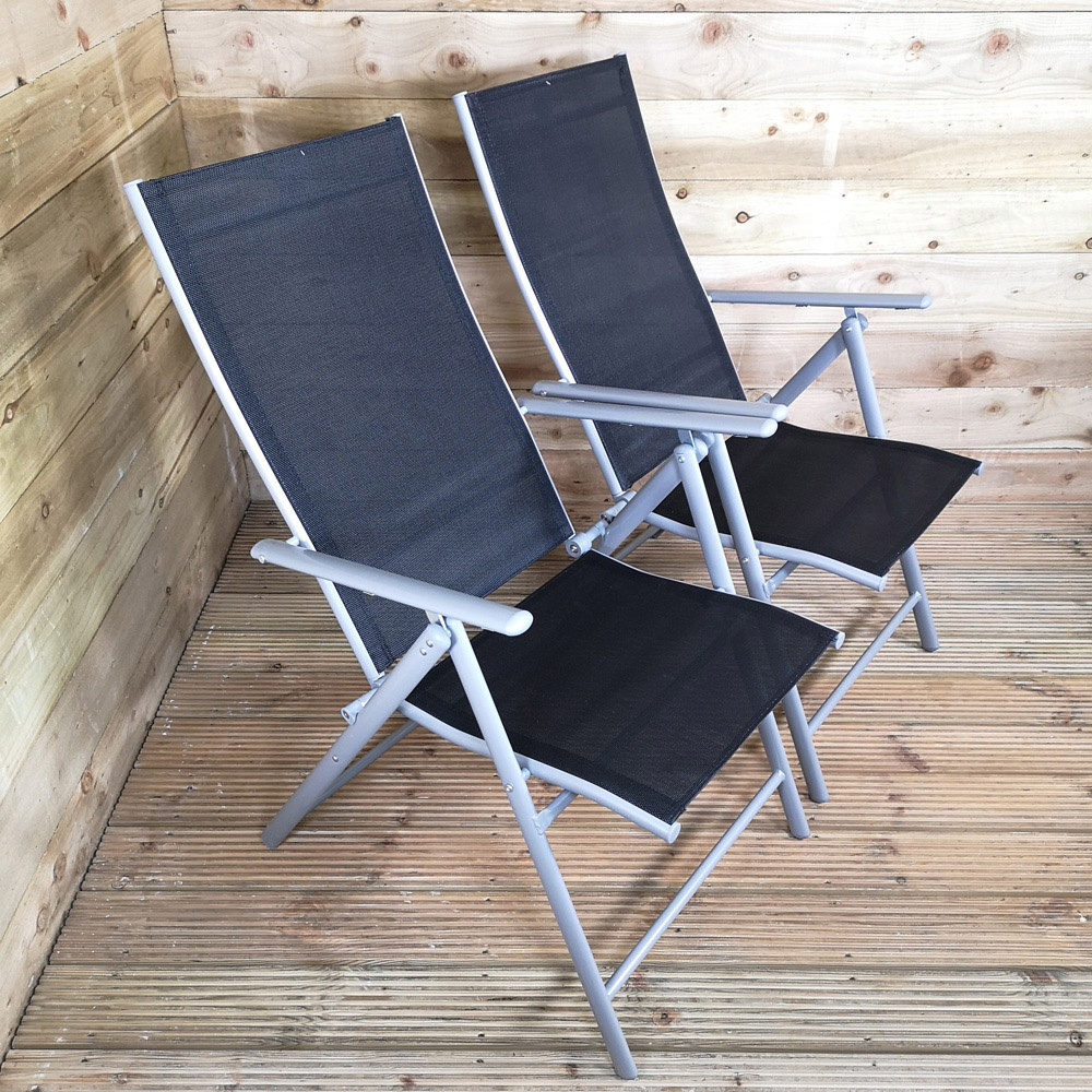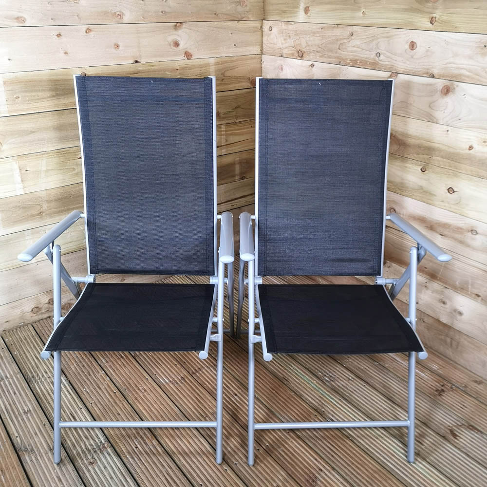 Enjoy your summertime outdoor space with this Set of Two Multi-Position Garden Reclining Folding Chair that fits perfectly into any outdoor setting, whether relaxing on your patio, balcony or garden. You can choose from nine positions to recline by adjusting the seat handles. The sleek black and silver design makes these chairs fit perfectly into any outdoor area, and their lightweight design makes it easy to manoeuvre them around. Both chairs have a solid steel frame that is long-lasting with breathable black material, water-repellent, and fast-drying textilene seat material. No assembly is required; unfold, and they can be used immediately. They are easy to fold back up for easy storage. The approximate dimensions are H78 x W55 x L59/101cm / Seat height: 44cm and 110kg is the maximum user weight. Protect your garden furniture with our durable and waterproof covers. Explore our wide range of heavy-duty Garden Furniture covers to find the perfect fit for your needs.