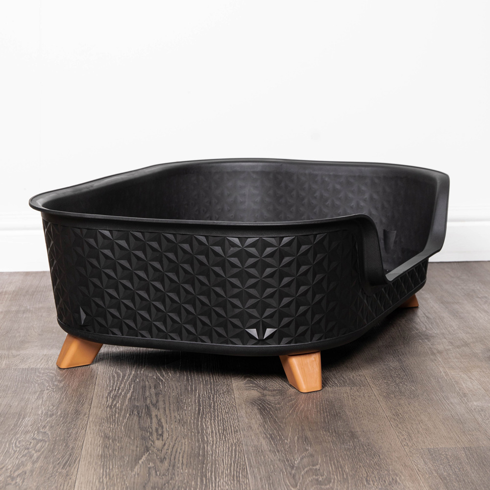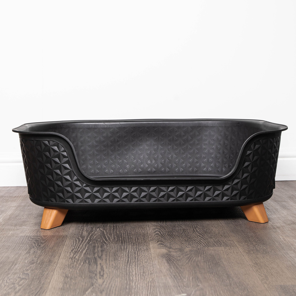 Let your pet relax in style with this modern pet bed. Perfect for anywhere around your home to let your pet rest comfortably. With a lowered entrance, this basket offers a practical solution for ease of access to older or smaller pets. Suitable for use with small and medium sized pets to bring them comfort and to feel at ease. Made with durable plastic, this basket is easy to maintain and keep clean for a long lasting use. The basket features a perforated base for maximum air circulation to help minimise any odours. With a modern diamond design this black basket will effortlessly blend in and compliment your home decor. The lightweight design and collapsible legs offer a convenient solution for easy storage or moving the basket to other rooms. The feet have rubber pads to help prevent any skidding whilst the wide base prevents the basket from tipping over. Simply wipe clean with a damp cloth and mild detergent. Product Dimensions: Height: 25cm. Length: 77cm .Width (front to back) 58cm. Entrance Width: 40cm. Inside Depth: 20cm. Collapsed Height: 20cm.