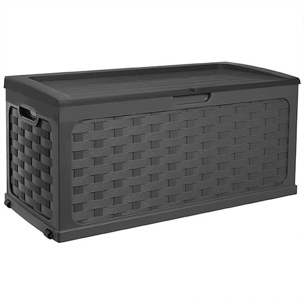 Make a functional and charming addition to your garden with Samuel Alexander Black Rattan Cushion Garden Storage Box 335L. Made from weatherproof polypropylene, this storage box has a black rattan design and comes with a lockable sit-on lid (padlock not supplied) that doubles as a bench seat that easily seats two adults. With a storage volume of 335 litres, it offers excellent outdoor storage so you can store away your gardening tools, seeds, fertiliser and more with ease. This storage box features wheels on both ends along with handles making moving it around easy.
