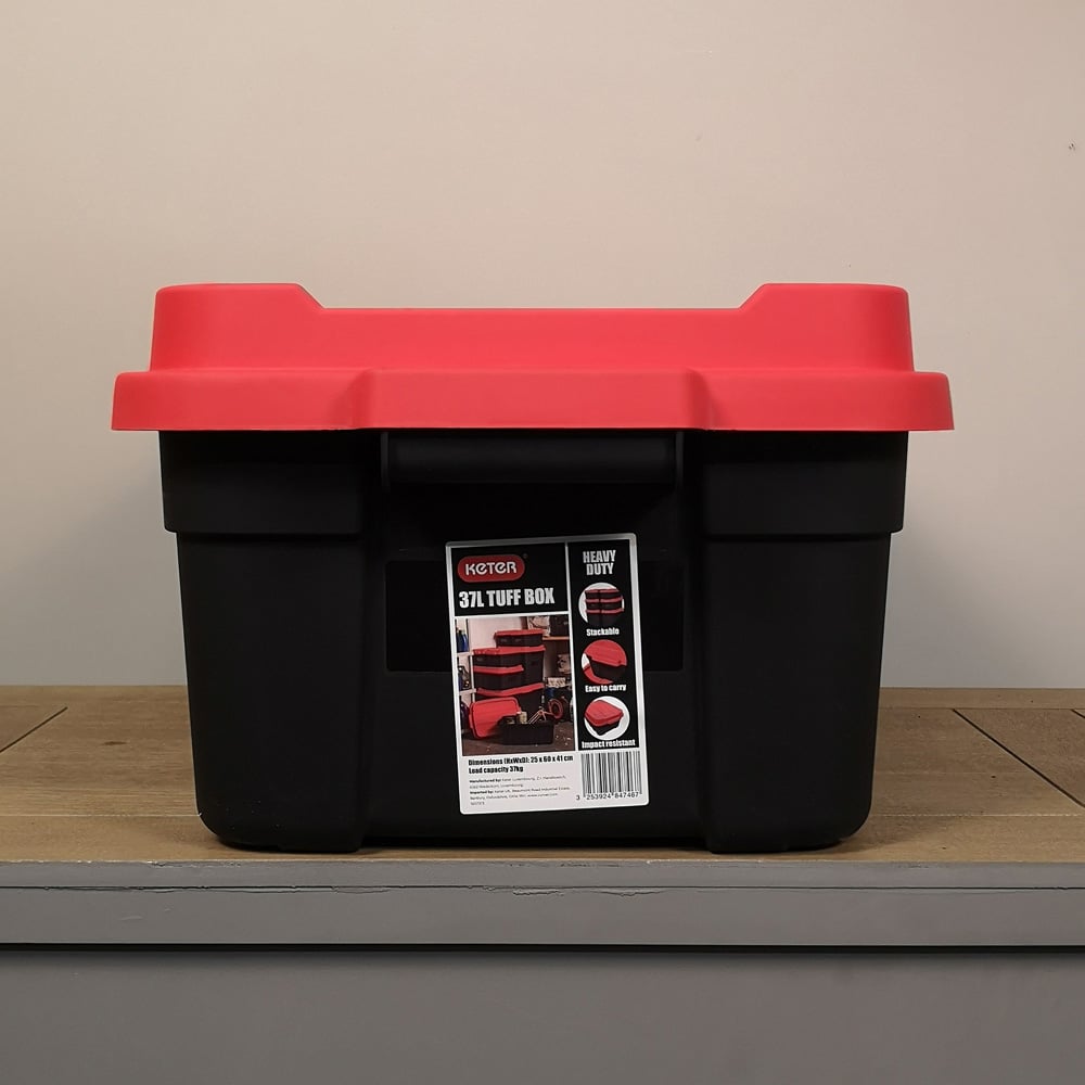 Keep your home, tools, accessories and essentials safe and organised with this 37 litre tuff box. Built to deliver rugged performance in a compact size, this small but mighty storage box is perfect for anyone who needs durable and secure storage at home or on the go. The ideal storage solution when you need portability, protection and practicality, all in a compact no fuss design. Perfect for anyone who wants to keep their belongings organised and secure. With stylish black box and red lid, the storage box has a generous capacity of 37 litres. The spacious interior offers space for tools, household essentials or personal items, the perfect choice for reducing clutter and staying organised. Ideal for homes, garages, sheds and workshops or on the go storage needs. Crafted from tough and robust plastic, this storage box offers long lasting protection against wear, moisture and impact with a secure snapping lid and stackable design to allow each box to be neatly stored away. The box is lightweight and easy to carry with comfortable, ergonomic handles and the flat, stackable design means you can organise multiple boxes without wasting space. Product Dimensions Exterior Height: 25cm Length: 61cm Width: 41cm Interior Height: 21cm Length: 49cm Width: 37cm Capacity: 37 Litres / 37kg