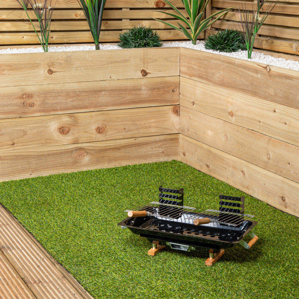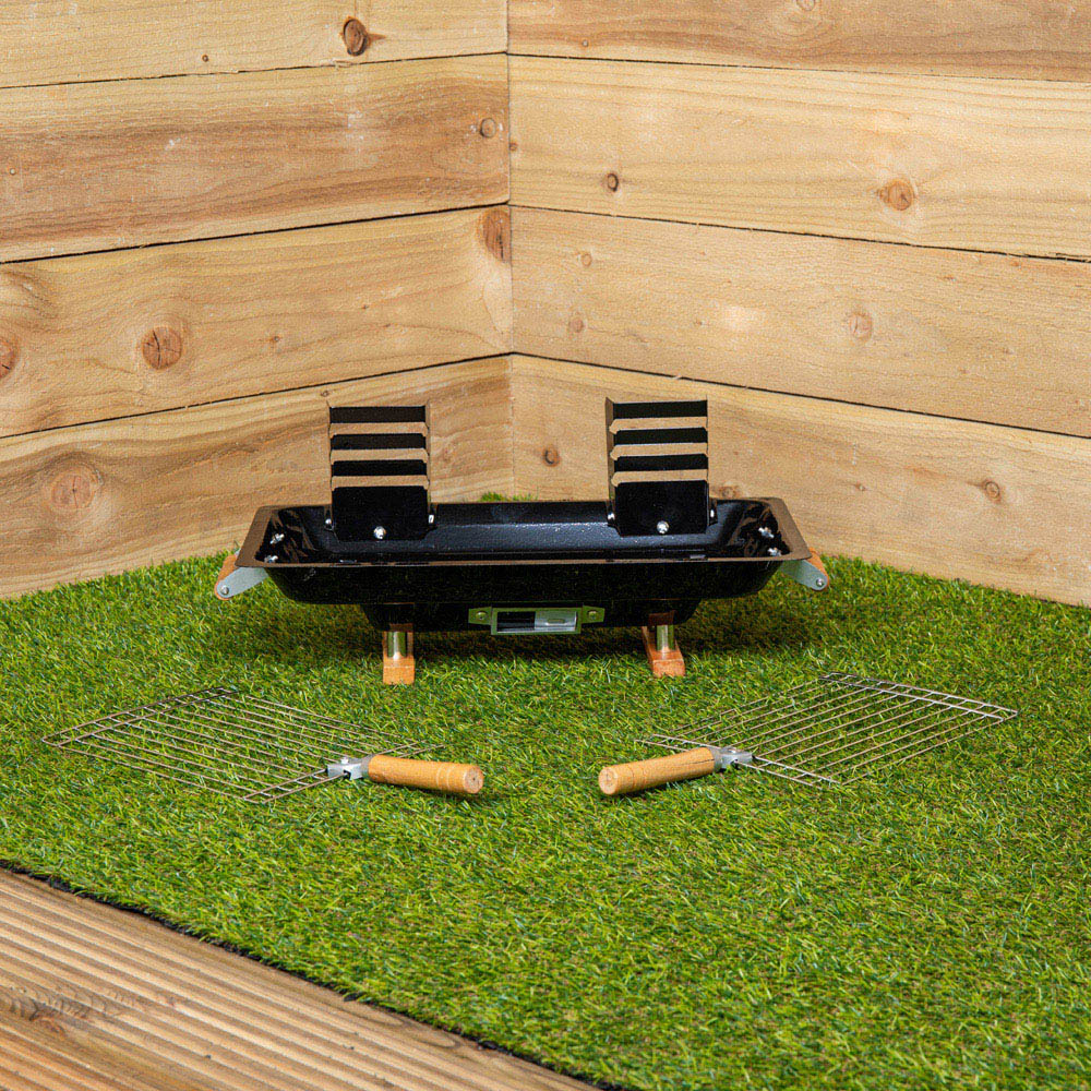 Enjoy your outdoor leisure time this year with this portable BBQ grill. This BBQ is easy to assemble, portable and ideal for use in your garden, at a picnic, day trip to the beach or on a camping trip with your friends or family. The BBQ features two chrome plated cooking grids with adjustable positions allowing you to cook your food just the way you like it. The built-in air vent allows you to adjust the airflow and control the heat levels to achieve the perfect balance of heat and smoky flavour. The grill is made with a high-quality enamelled fire bowl that ensures durability and a long-lasting performance and also features natural wooden handles to allow easy handling. Cooking Heights: 13cm, 14.5cm and 16.5cm Grill area: 23.3cm x 17.7cm Overall Height 19cm.
