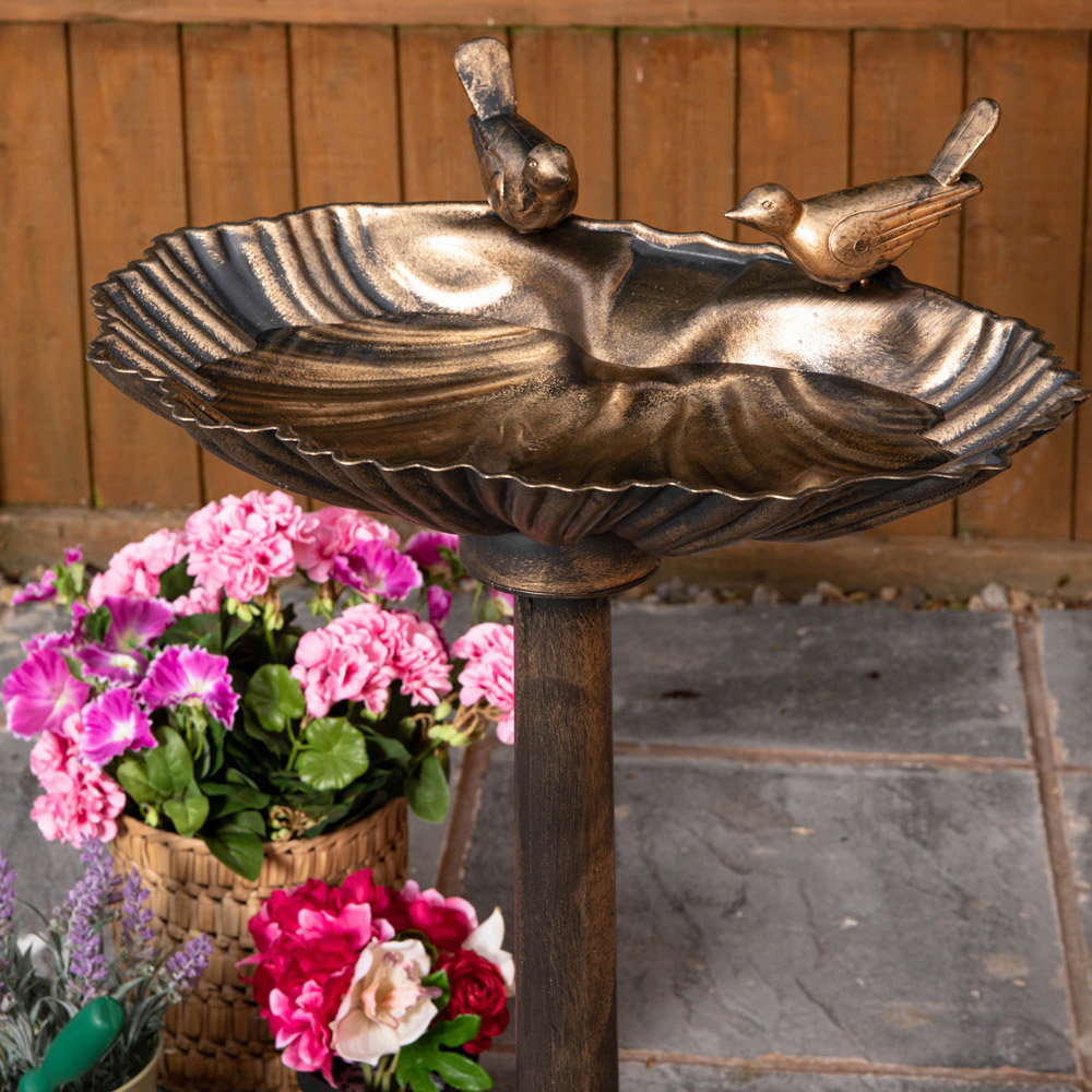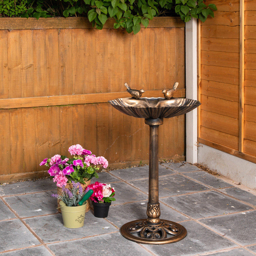Enhance your outdoor space with this bronze-effect bird bath. Designed to attract wildlife and add a touch of elegance to any setting, this bird bath is perfect for bird enthusiasts, gardeners and anyone who loves nature. This bird bath is sure to become a charming focal point in your outdoor oasis. Made from high-quality, strong yet lightweight plastic, this bird bath is both durable and easy to move, ensuring long-lasting performance. The Bronze effect finish gives a classic, timeless look that complements a range of garden styles to blend seamlessly. This bird bath offers both functionality and aesthetic charm, allowing you to attract birds while enhancing the beauty of your garden. At 81cm high, the bird bath offers great protection for the birds from larger predators, allowing the birds to be safe. A bird bath is a vital source of water for drinking or bathing for birds in hot or cold weather, which is especially important in the summer months when birds can overheat and need to cool down. Quick and easy assembly, each piece screws into place without the need for any tools. Product Dimensions Height: 81cm, Length: 49cm, Width: 34cm.
