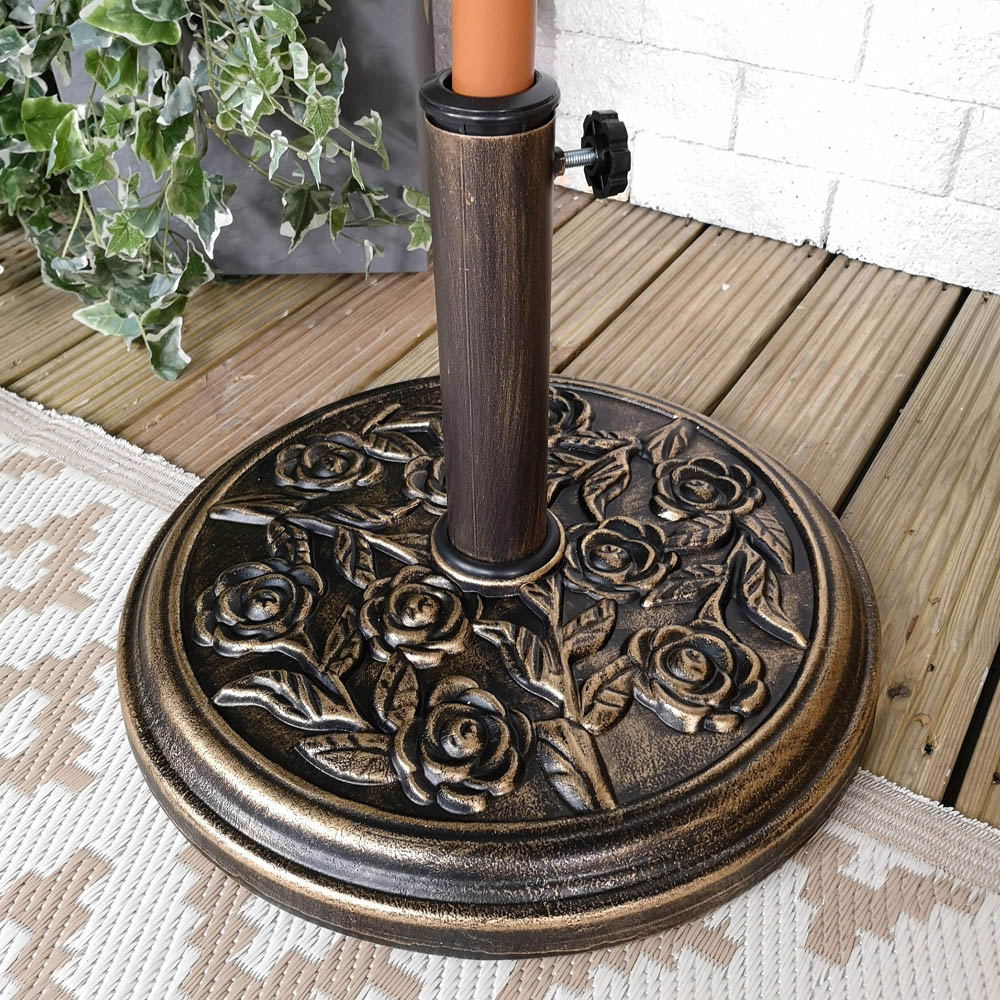 Secure your garden space with this Bronze Parasol Base by Samuel Alexander. This cast iron effect parasol base has strong resin materials that make a great addition to any garden decor. The eye-catching rose design perfectly complements your parasol, umbrella, or even your dining set. Setting up the cast iron parasol base is easy, and you will be ready to secure your parasol in minutes. You can choose the correct spacers and adjust the tightening knob for a secure parasol for many years to come. It is perfect for any garden furniture, with the rose design on a bronze cast iron effect creating an eye-catching addition to any outdoor space, garden, patio or balcony. Dimensions – H35 x W45 x L45cm. The weight of the base is 9kg.
