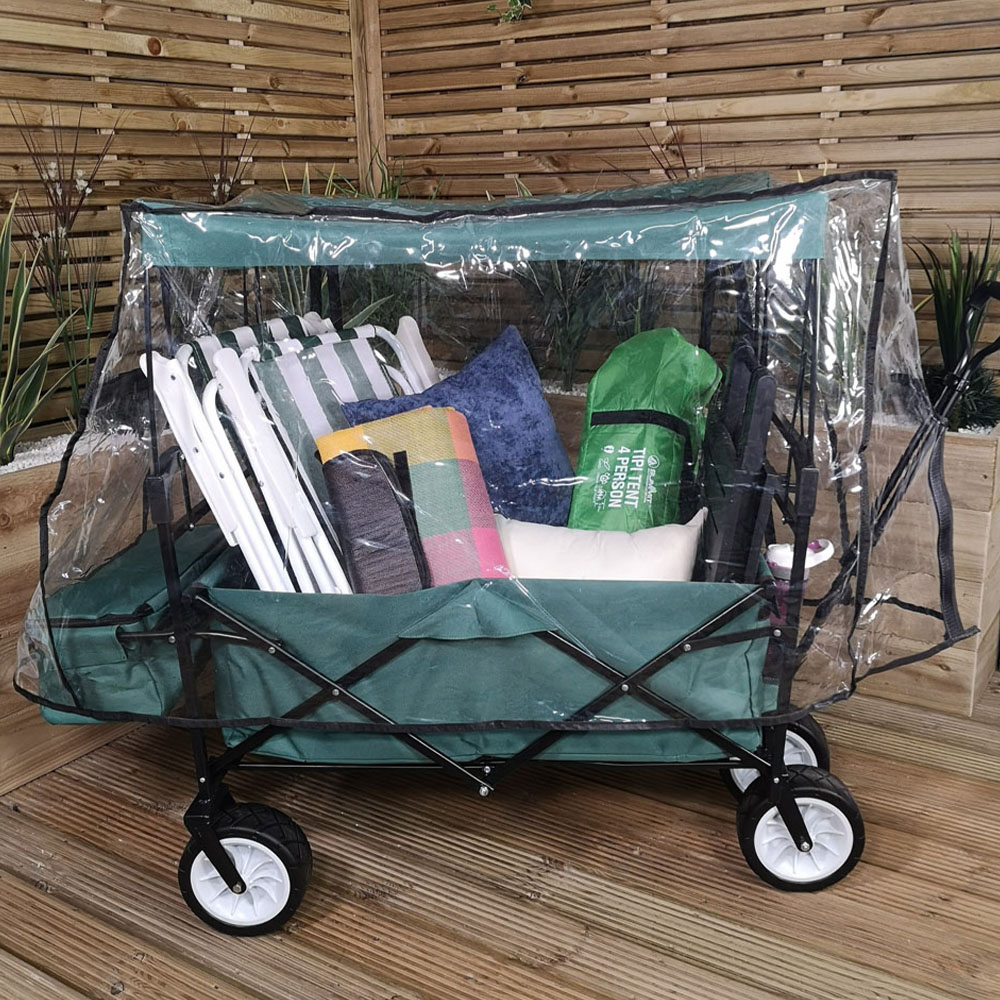 The Samuel Alexander Clear Waterproof Cover is the perfect addition to your folding trolley wagon. This waterproof cover is designed for easy use and installation. Simply drape it over the trolley, pull it down at the sides, and fasten it with the zips. It provides excellent protection from environmental factors, making it an essential travel accessory. Additionally, it is easy to clean and store away when not in use. The cover is durable, transparent, and odour-free. Please note that this listing is for the cover only, and the wagon trolley is not included. With this waterproof cover, you can keep your items safe and dry during your camping adventures.