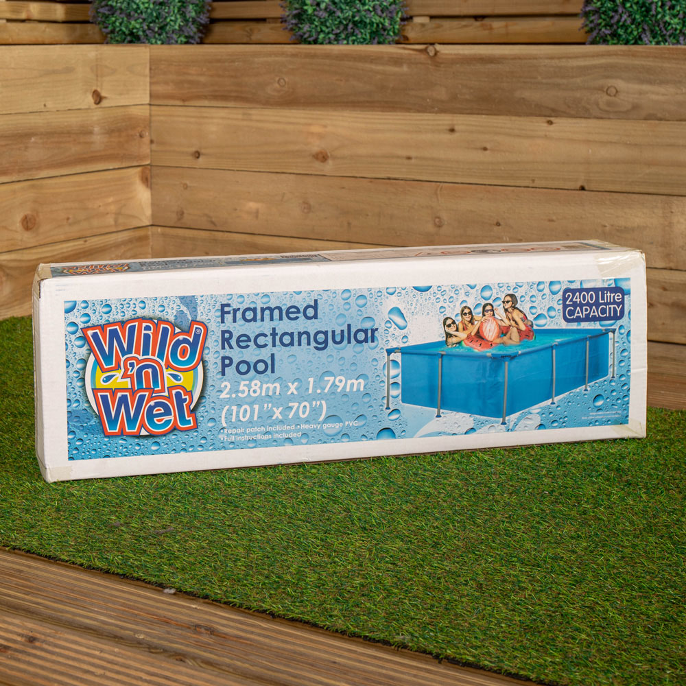 Bring serious summer fun to your own back garden with this huge rectangular framed pool. A sturdy, spacious, and family-friendly pool designed for hours of outdoor enjoyment. Designed with convenience in mind, this rectangular pool transforms your outdoor space into a personal splash zone. Quick to set up, fun to use, and reliable all summer long. With an impressive 2400-litre water capacity and large footprint of 2.58m x 1.79m, this framed pool offers enough room for the whole family to splash, paddle, and relax in style. Built for durability and easy assembly, this pool features a metal frame and PVC walls that ensure long-lasting performance. Whether you're hosting a garden gathering or simply keeping the kids cool, this pool delivers backyard fun with minimal fuss. Supplied with a repair patch kit for quick, easy fixes to small punctures. Product Dimensions Length: 2.58m Width: 1.79m 2400 Litre Water Capacity.