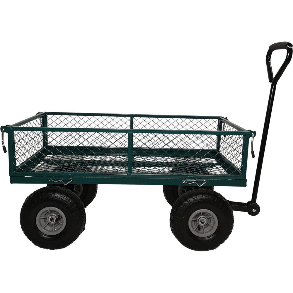 Make your gardening task easy with the Samuel Alexander Green Heavy Duty Metal Garden Wheelbarrow. Whether you need to transport garden waste, plant pots, materials, or tools, this trolley cart is up to the task. With its large metal mesh cage, this truck can hold a variety of items and can be filled to the top. The side panels can be easily dropped down for quick access. The truck is equipped with four hard-wearing wheels, making it suitable for most terrain surfaces. It also features a long padded pull handle for easy steering and manoeuvrability. Please note that self-assembly is required as the truck is supplied flat packed. The internal dimensions of the truck are L83 x W43 x D21cm. The handle length is 72cm and the wheel diameter is 25cm. The overall dimension of the truck is H88 x W44 x L99cm. It has a load capacity of 150-180kg, making it ideal for heavy-duty tasks.