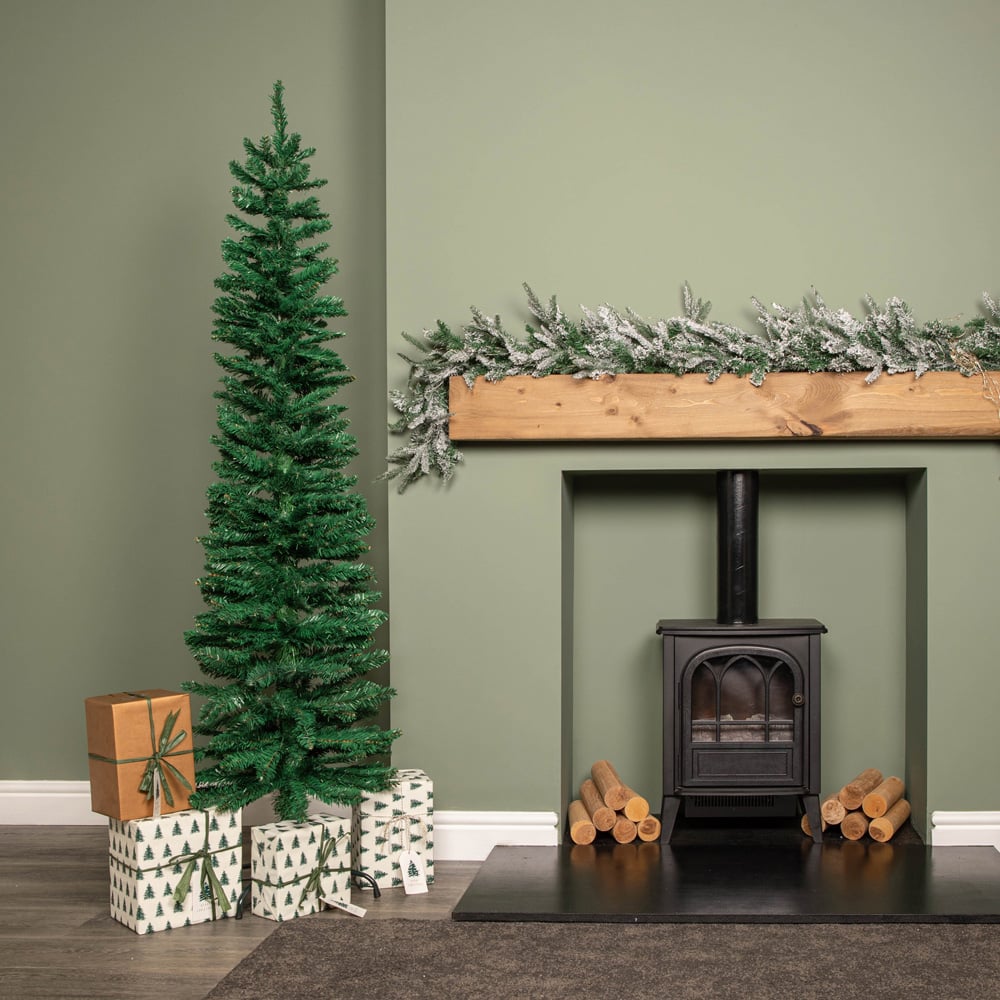 Elevate your Christmas decorations with the Samuel Alexander Green Pencil Artificial Christmas Tree with Green Metal Stand 6ft. This artificial tree is an excellent choice for any display, whether by the fireplace, in the window, or showcased in the hallway. It brings a joyous and festive cheer to your home, welcoming the guests with the cheerful warmth of Christmas. Bringing trees indoors has been a tradition for thousands of years to celebrate winter festivals, symbolizing that spring is just around the corner. This tree stands tall at 6ft and offers ample space to hang decorations and lights. The tree comes in sections and features 321 tips with PVC-hinged branches, making it easy to achieve a full, lush look. It includes a green metal base stand, which folds down for convenient storage. Please note that the branches should be fluffed and rearranged to achieve a realistic appearance. The tree measures five feet tall with a width of 51cm at its widest point, and the metal stand has a size of 40cm. This tree is suitable for indoor use only.