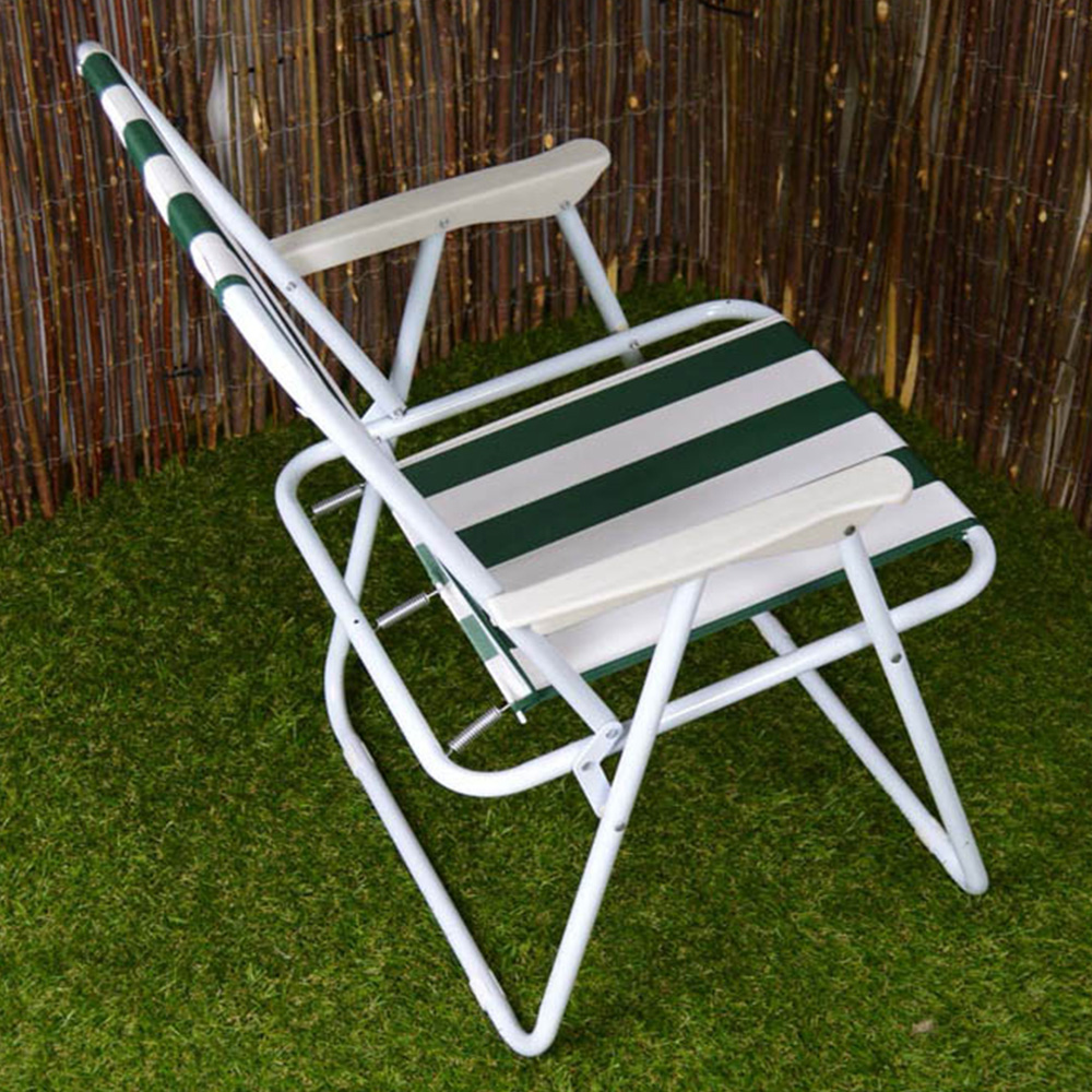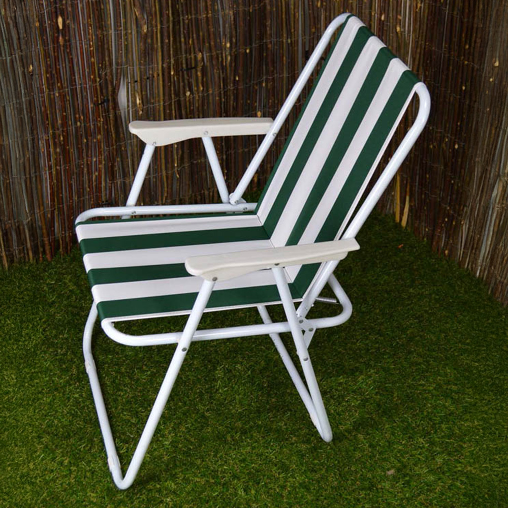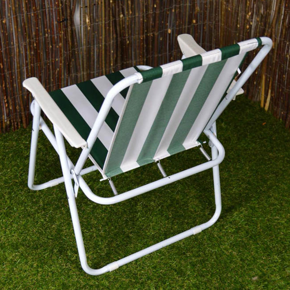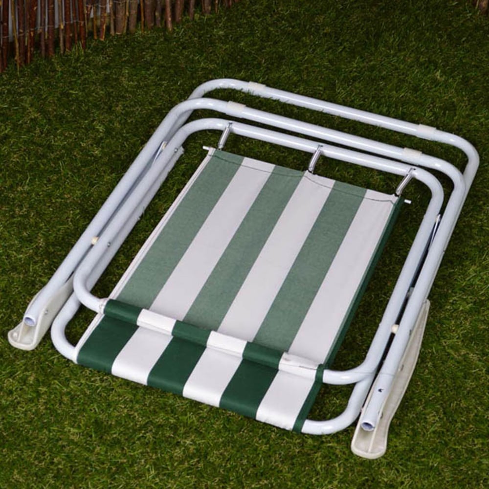 This Samuel Alexander Green and White Folding Camping Chair Set of 2 is perfect for outdoor relaxation. This set includes two comfortable striped camp chairs, ideal for use in the garden, at the beach, or on camping and picnic trips. Each chair folds down neatly for easy storage and transport, making them a convenient addition to your outdoor gear. With dimensions of 76cm back height, 38cm seat height, and 33cm seat width, these chairs provide ergonomic comfort and versatility for various outdoor activities. Enjoy the convenience and style of these durable folding chairs wherever you go.