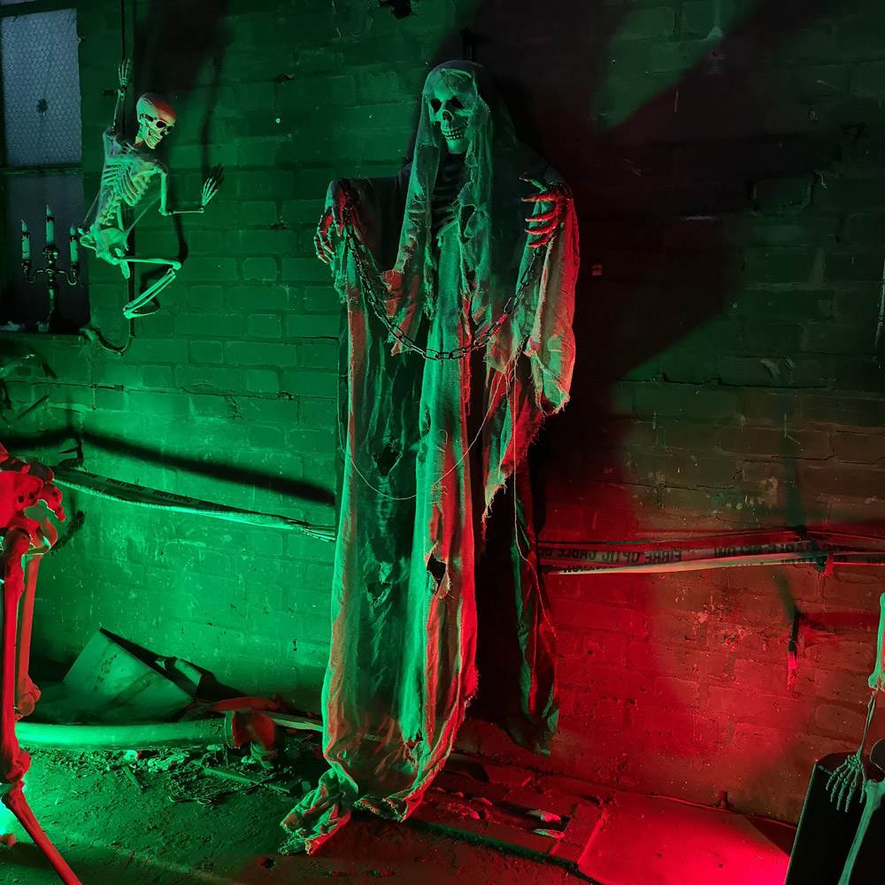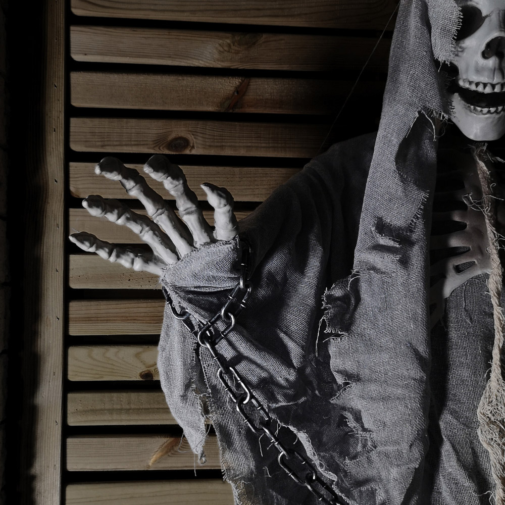 Make your Halloween more spooky with the Samuel Alexander Grey Skeleton Ghost Hanging Halloween Decoration 6.5ft. Made from durable plastic, this skeleton ghost wears a grey and black cape to make your home Halloween-ready. It comes with shackled hands and a distressed grey finish to give an authentic touch to your Halloween decor. Plus, it features a black hanging string to allow you to suspend it from anywhere. Suitable for indoor and outdoor use, place this decoration in the garden, porch or courtyard and create a spooktacular Halloween look. Size: H200 x L80 x W20cm.